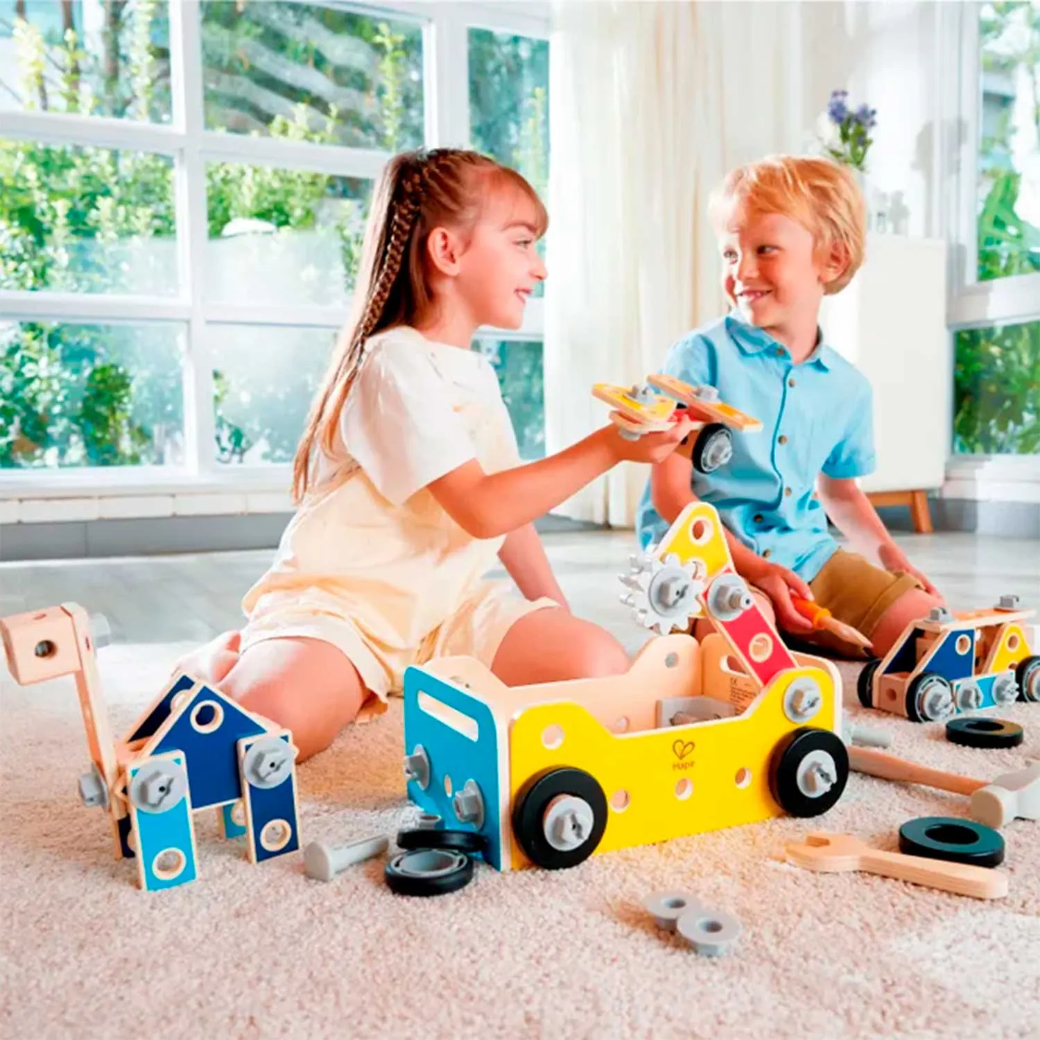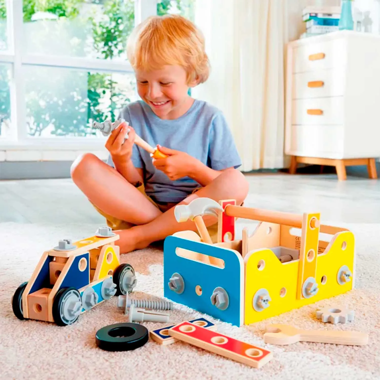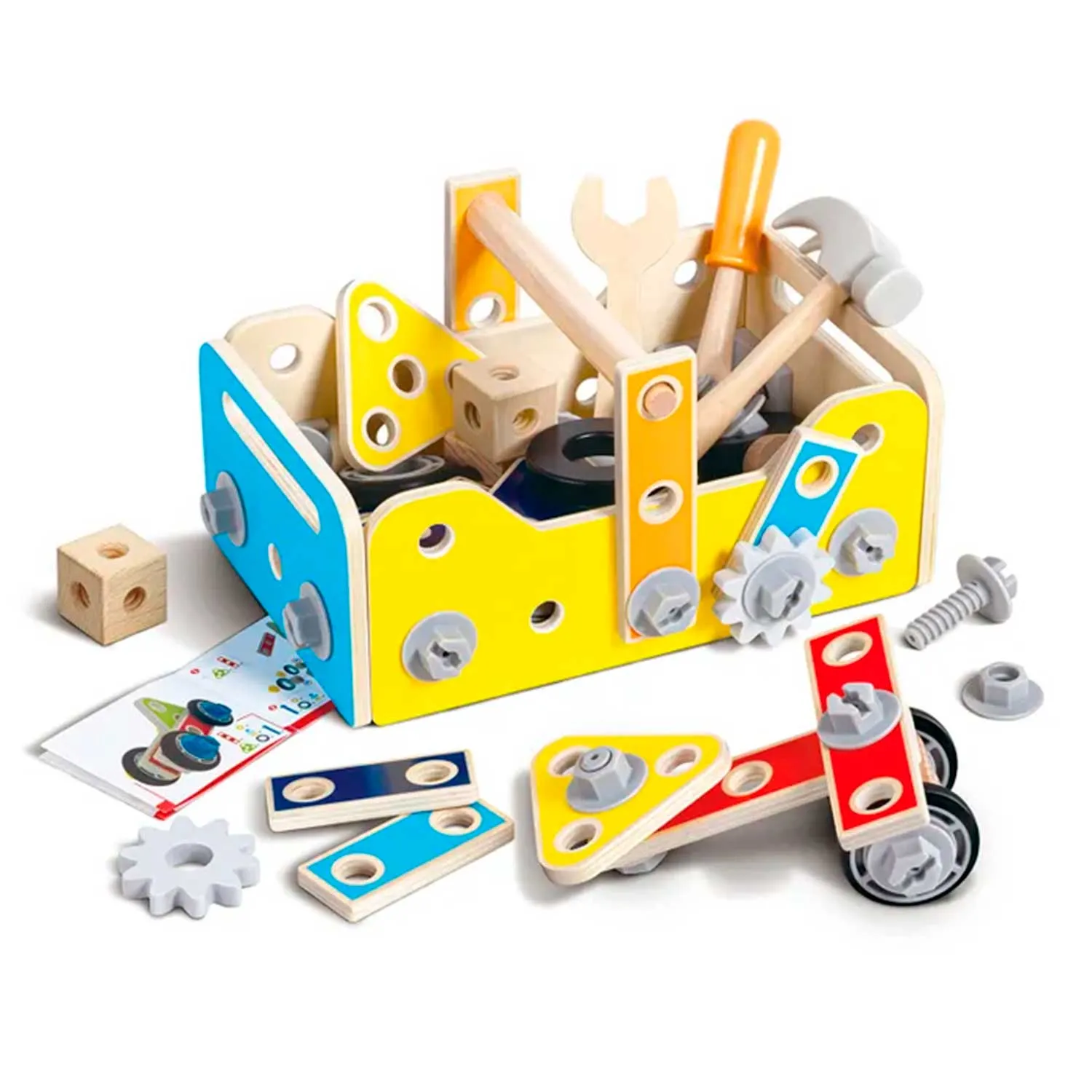 - в комплект входят 83 детали, включая игрушечные инструменты, винты, гайки и строительные элементы