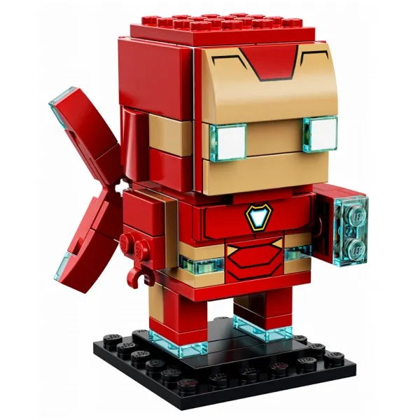 Из деталей набора вы сможете собрать Железного человека в стиле Lego BrickHeadz. Серия Lego BrickHeadz – это наборы конструкторов, каждый из которых позволяет вам собрать одного популярного персонажа из фильма, мультфильма или комикса. Фигурки всегда сделаны в едином стиле: большая голова и 2 больших глаза, маленькие ручки и ножки. Однако благодаря деталям, формирующим красный костюм Железного человека, он становится легко узнаваемым.