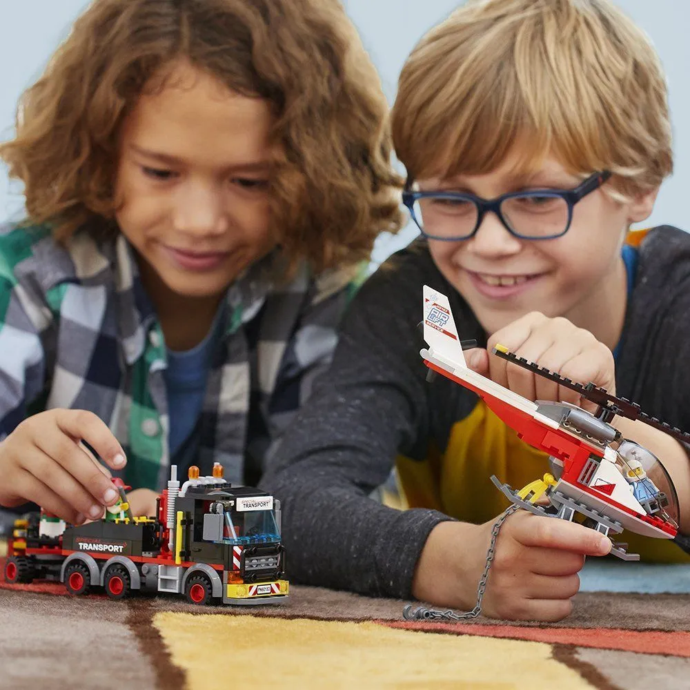 Конструктор Лего из серии "Сити" предлагает ребенку разыграть увлекательный сюжет, используя перевозчик тяжелых грузов.