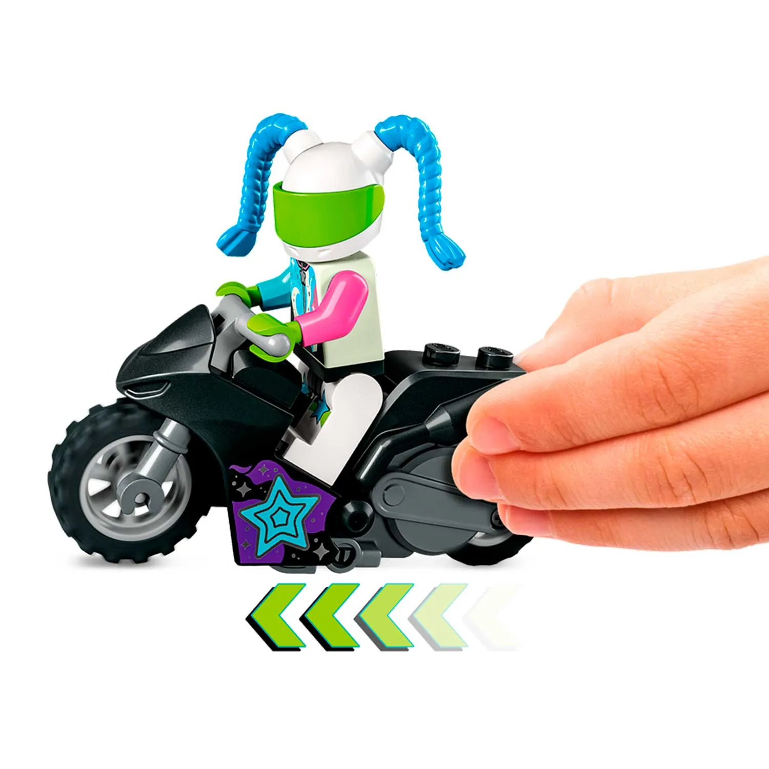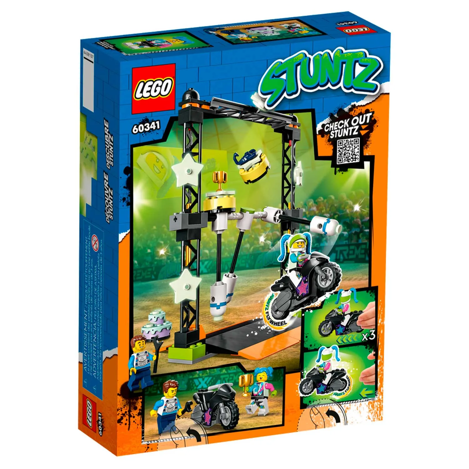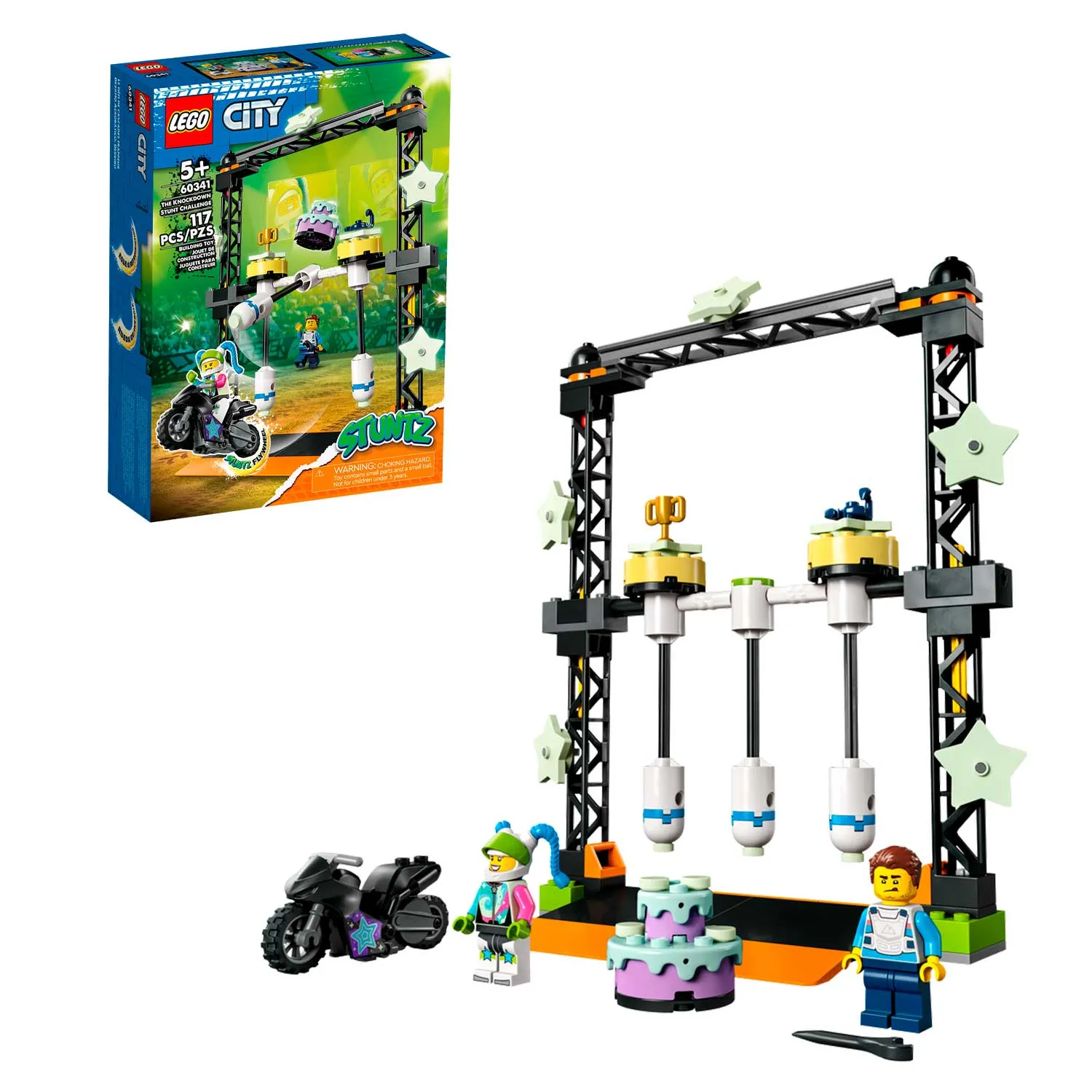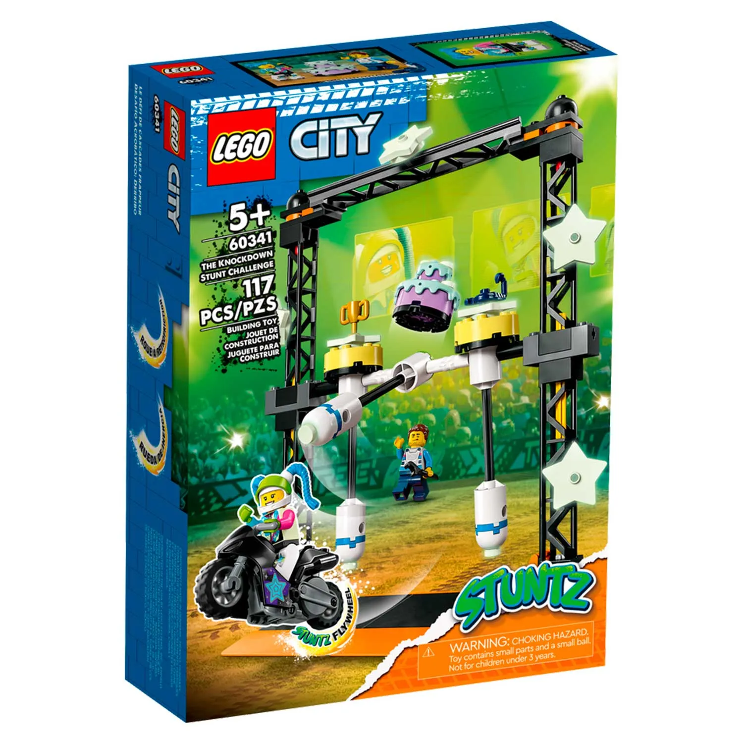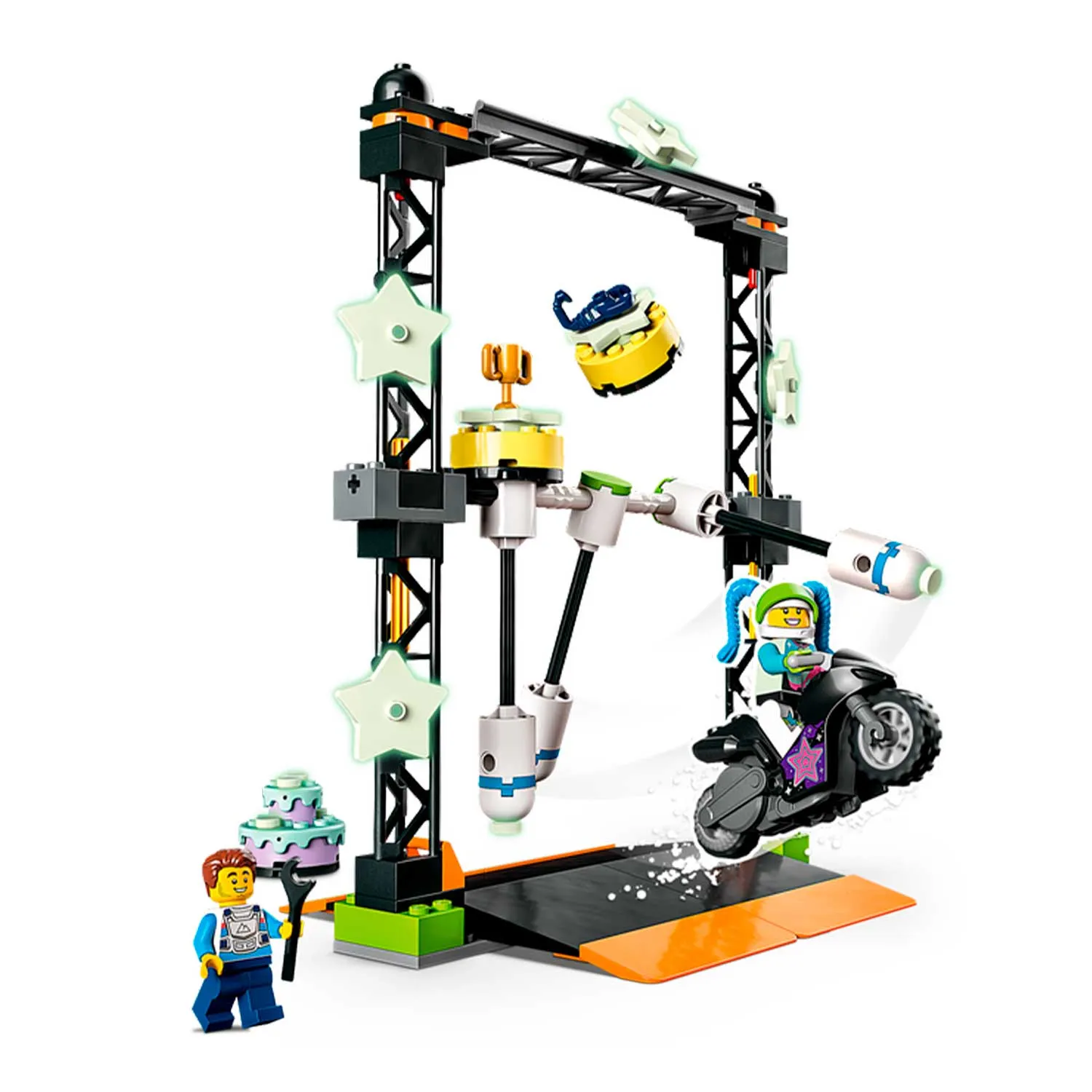 Конструктор Лего из серии "Сити" предлагает ребенку разыграть увлекательный сюжет на арене для шоу каскадёров.