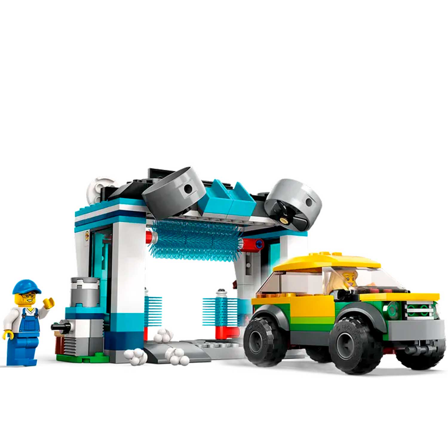 - интерактивные элементы: дети могут управлять автомобилем на автомойке, вращать щетки и распределять мыльную пену LEGO, что добавляет элемент интерактивности и веселья