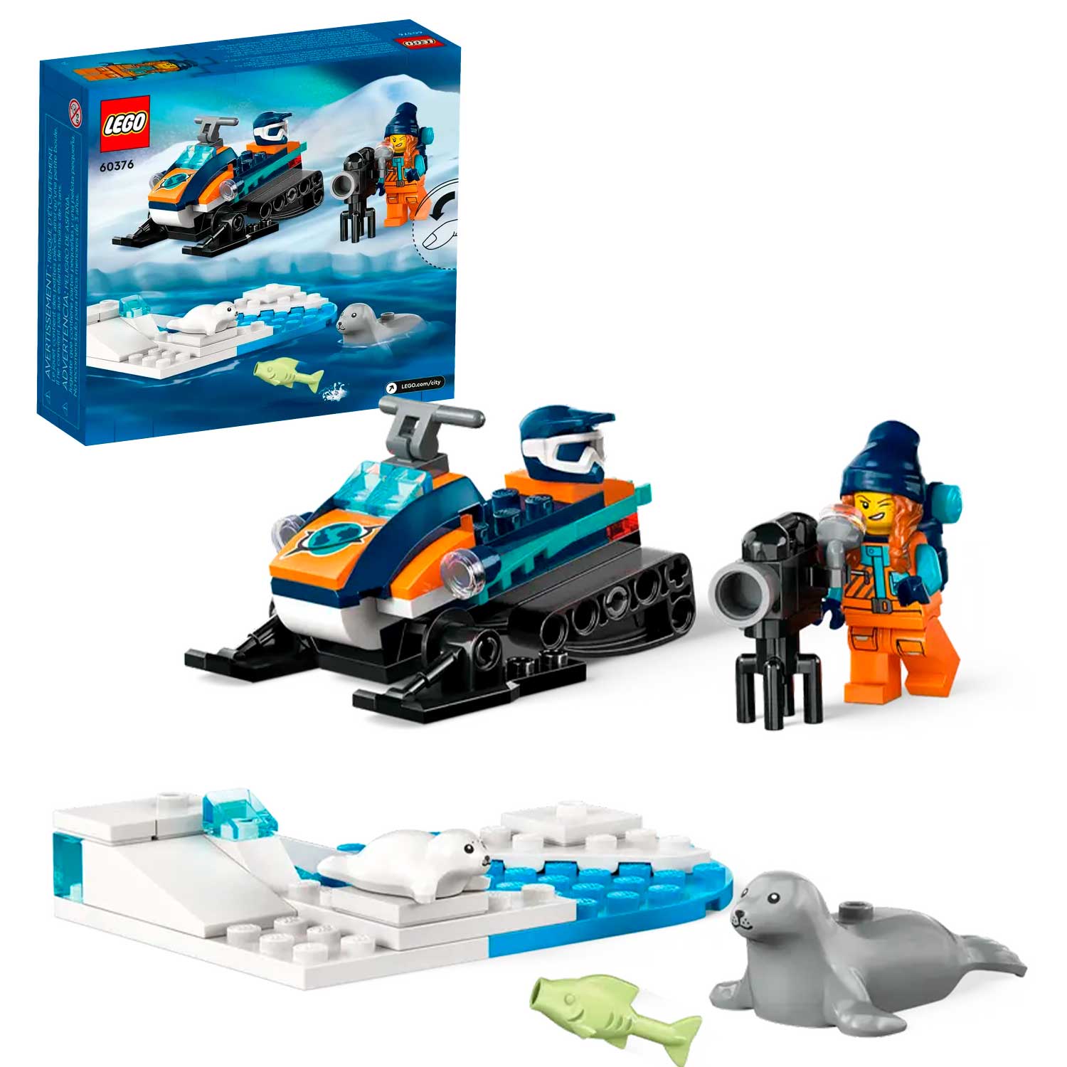 - в комплект входит игрушечный снегоход с гусеничными колесами и лыжами, арктическая обстановка в виде льдин, мини-фигурка исследователя, а также фигурки тюленей и тюленят