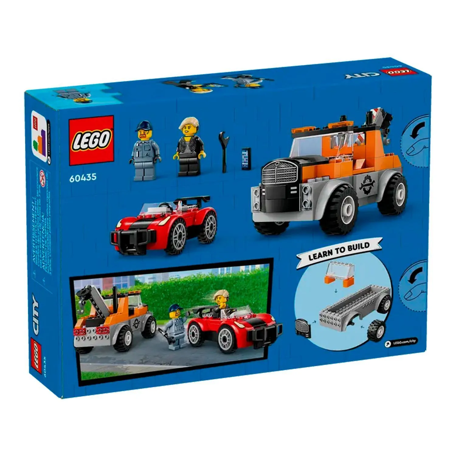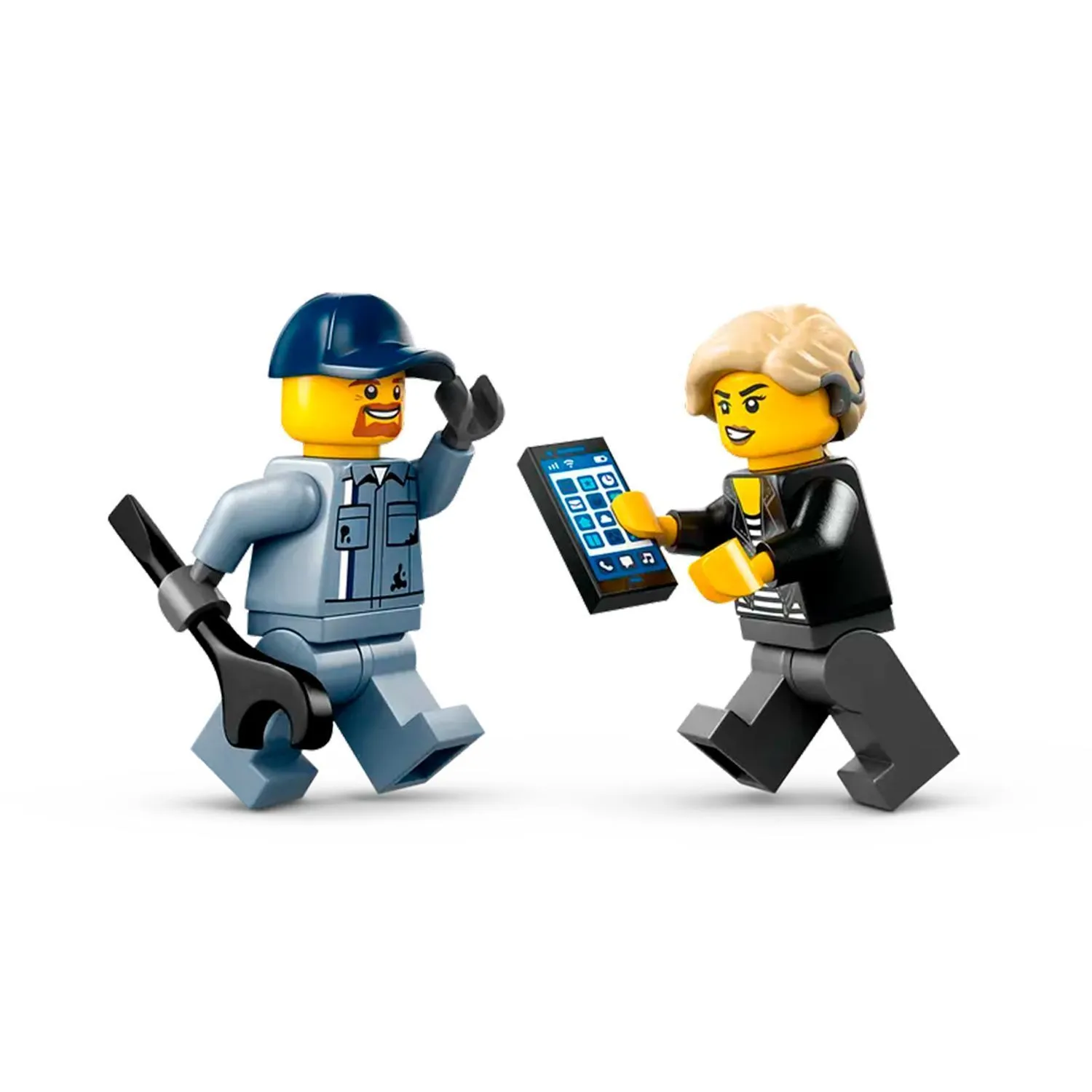 - в набор входят 2 минифигурки – водитель эвакуатора и водитель спортивного автомобиля, а также различные аксессуары, такие как гаечный ключ и дорожные конусы