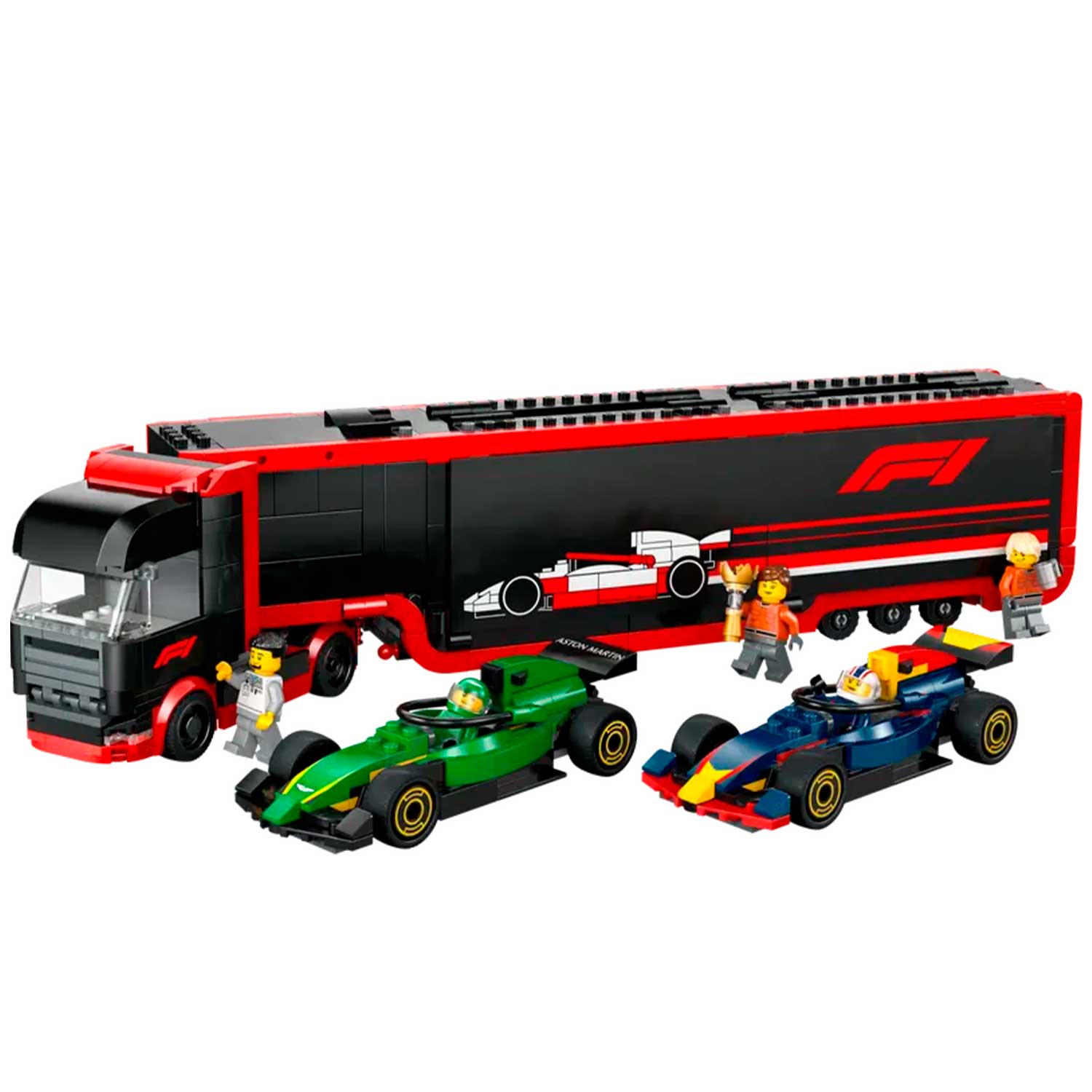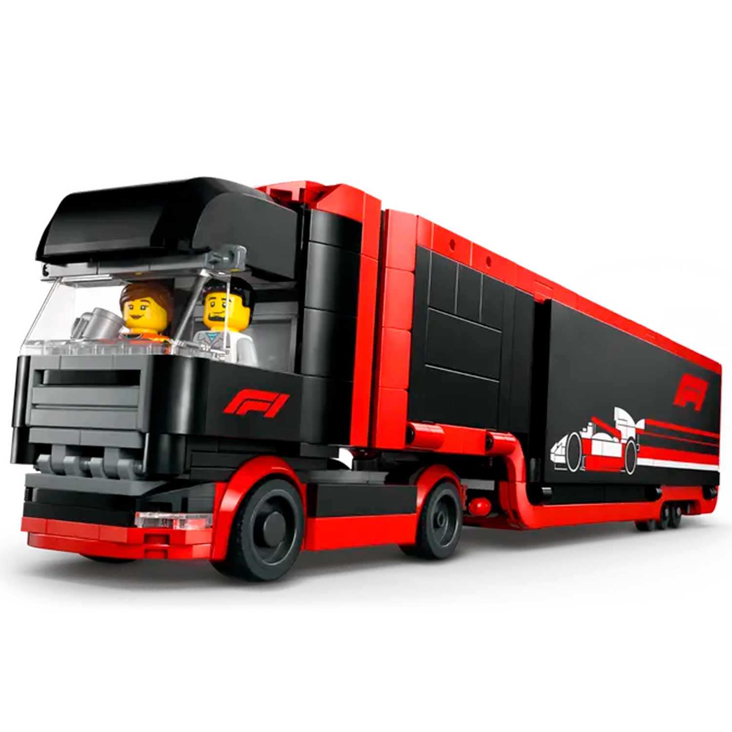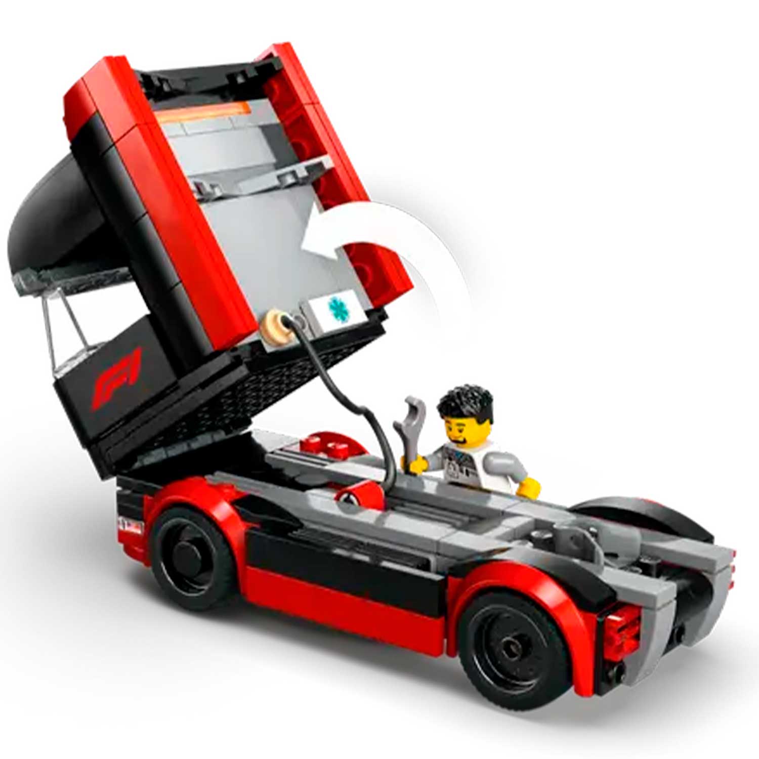 - этот премиальный игрушечный транспортный грузовик оснащен съемным низкорамным прицепом с комнатой для симулятора F1 и двойным отсеком для транспортных средств с полностью открывающимися боковыми панелями