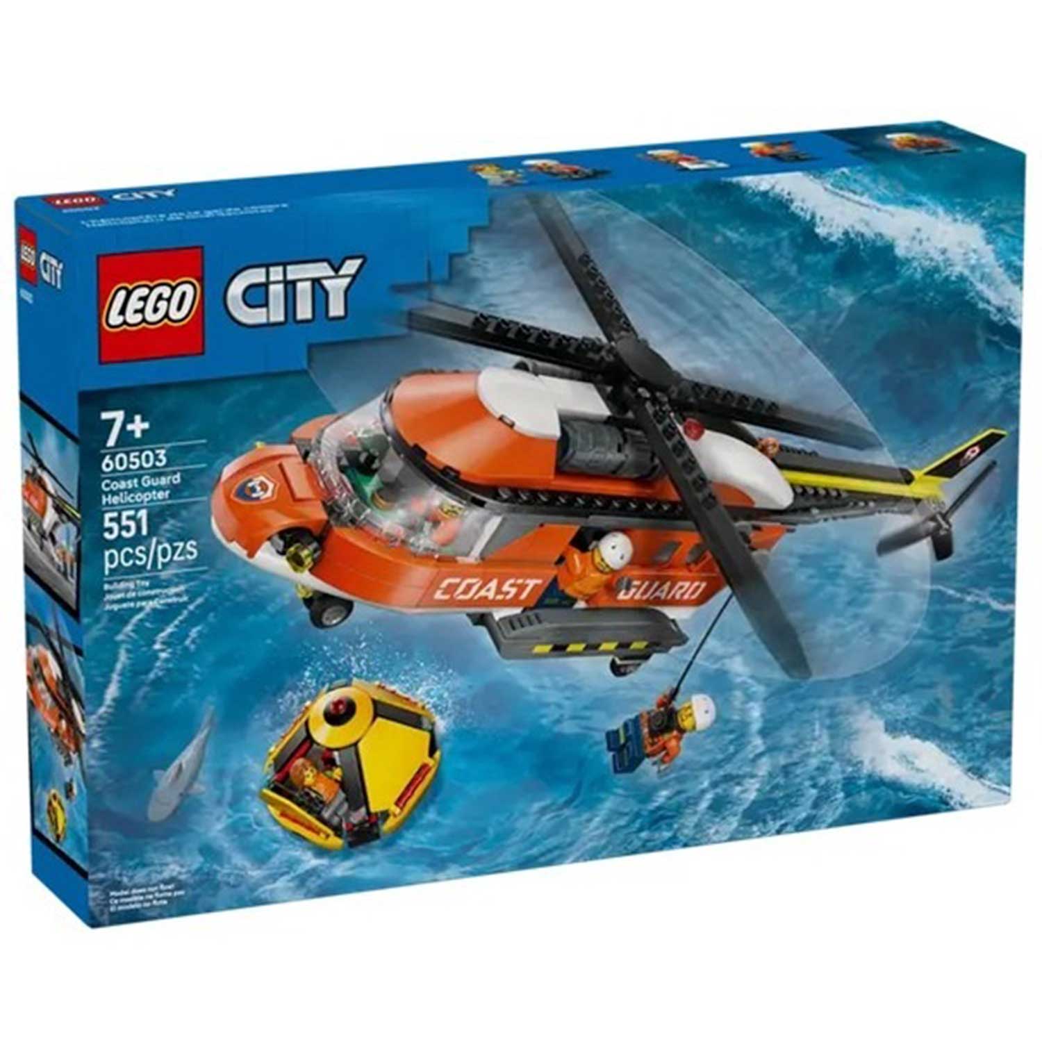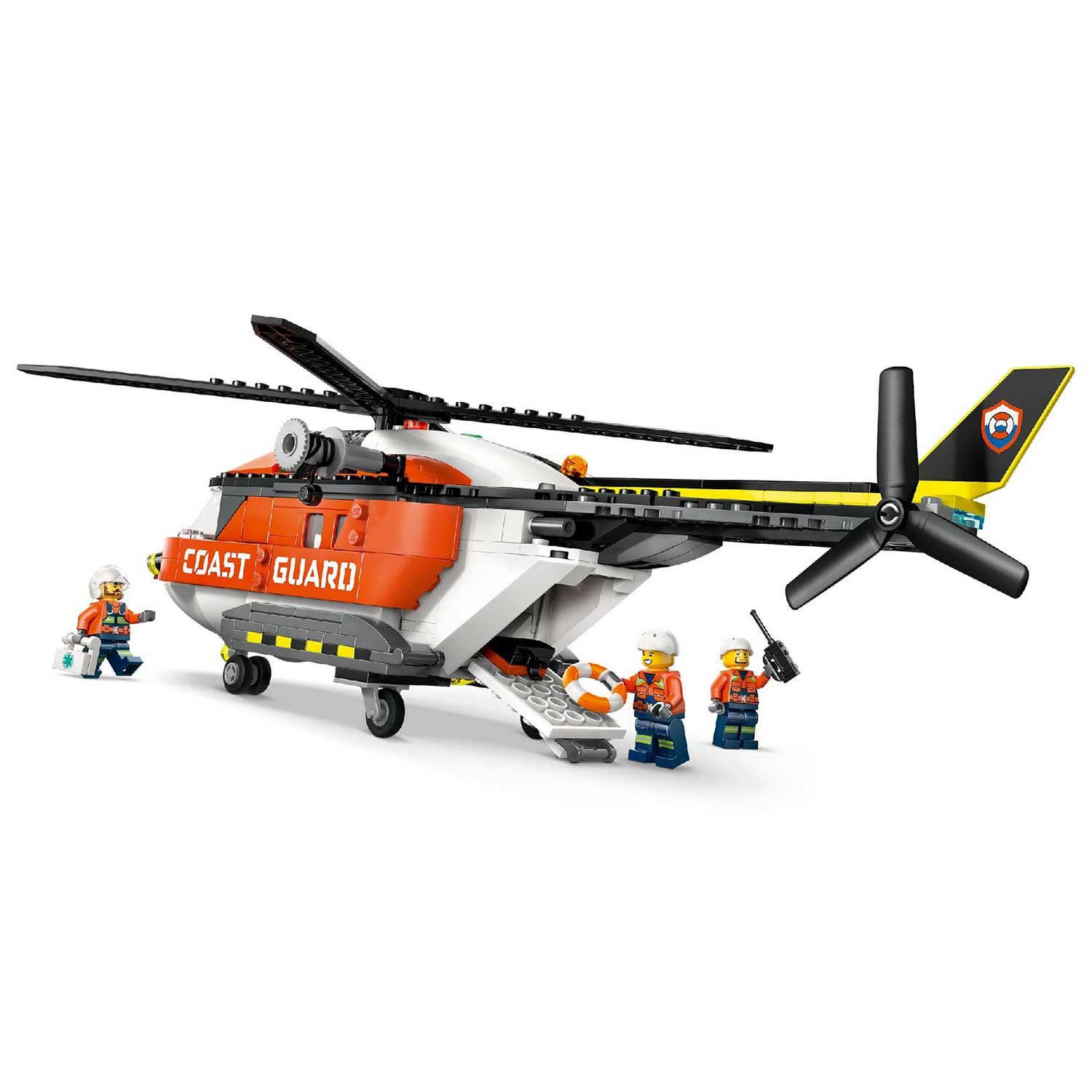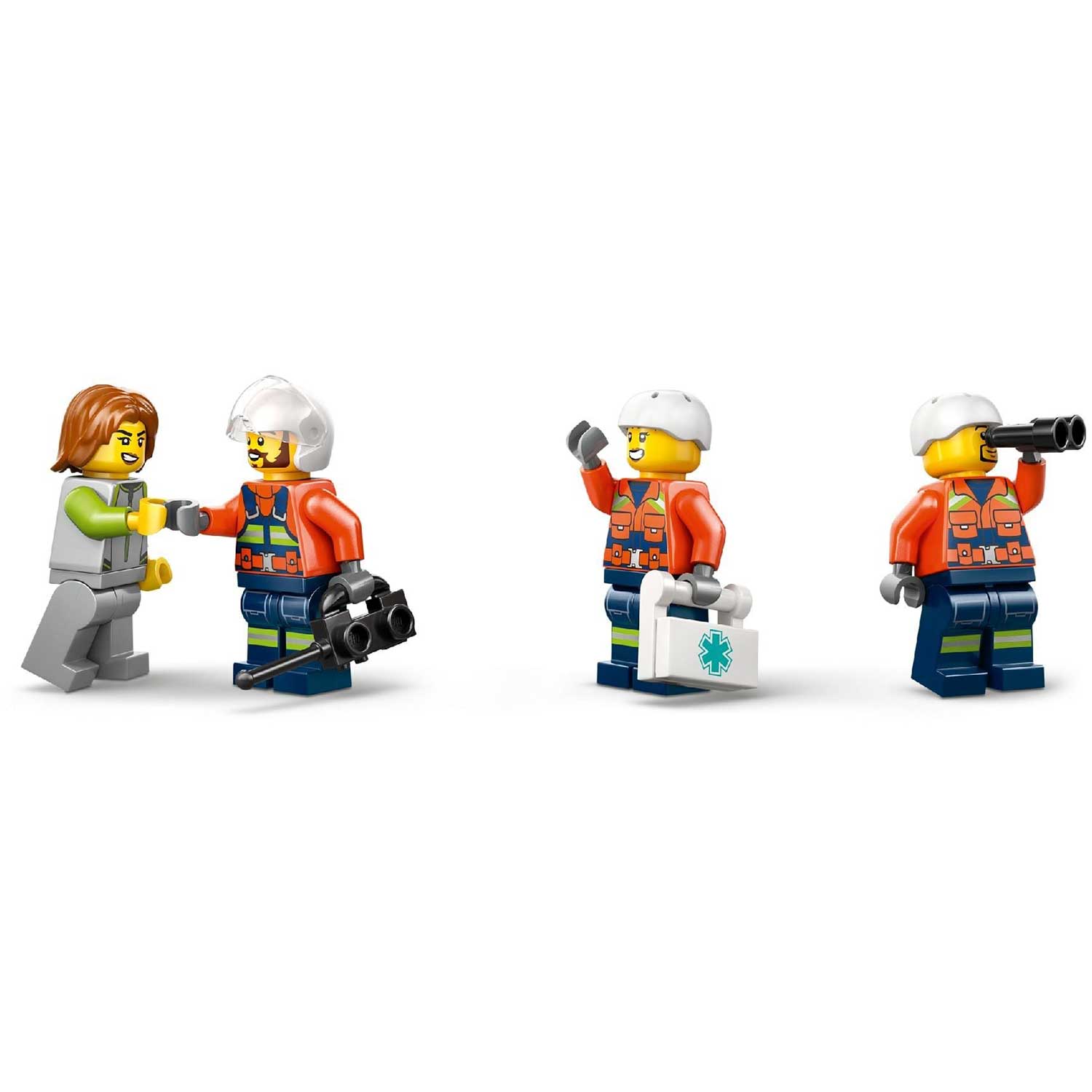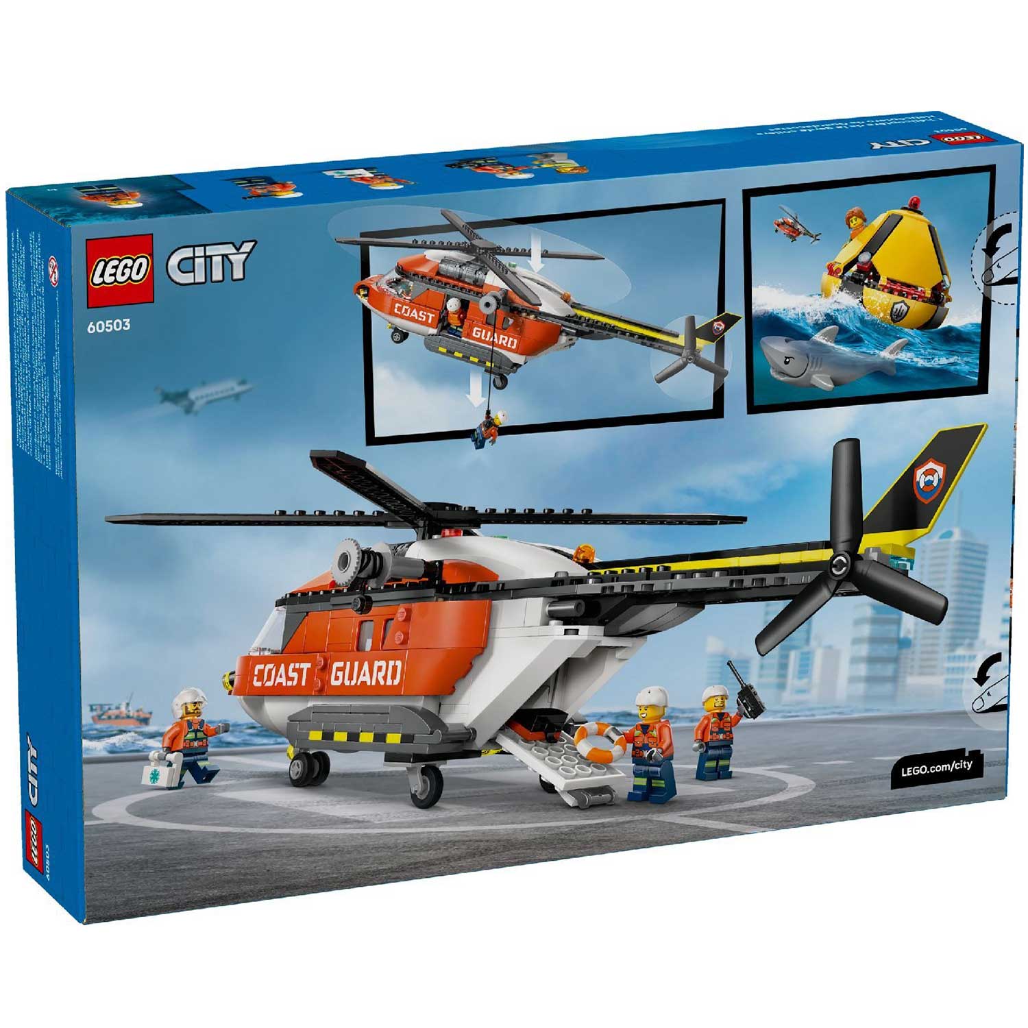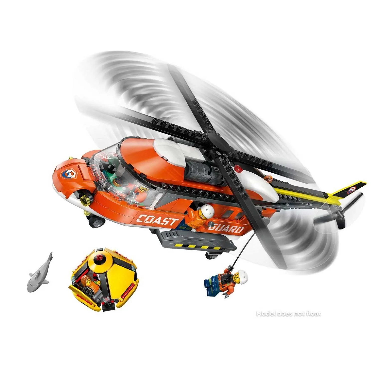 - минифигурки и аксессуары: в комплект входят пилот, два береговых охранника, гражданский персонаж и даже фигурка акулы для создания напряжённых сюжетов. Дополнительные аксессуары — аптечка, бинокль, рация и спасательный круг