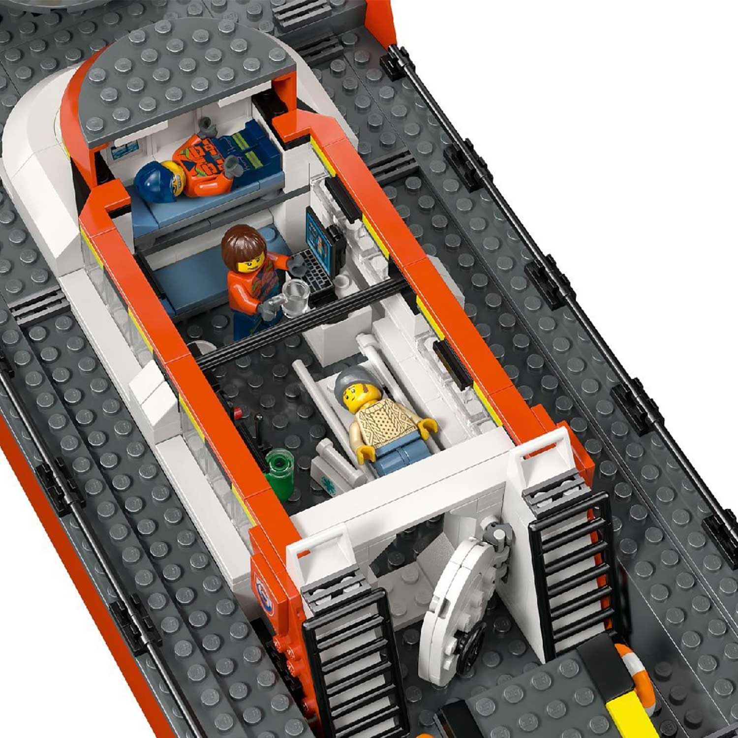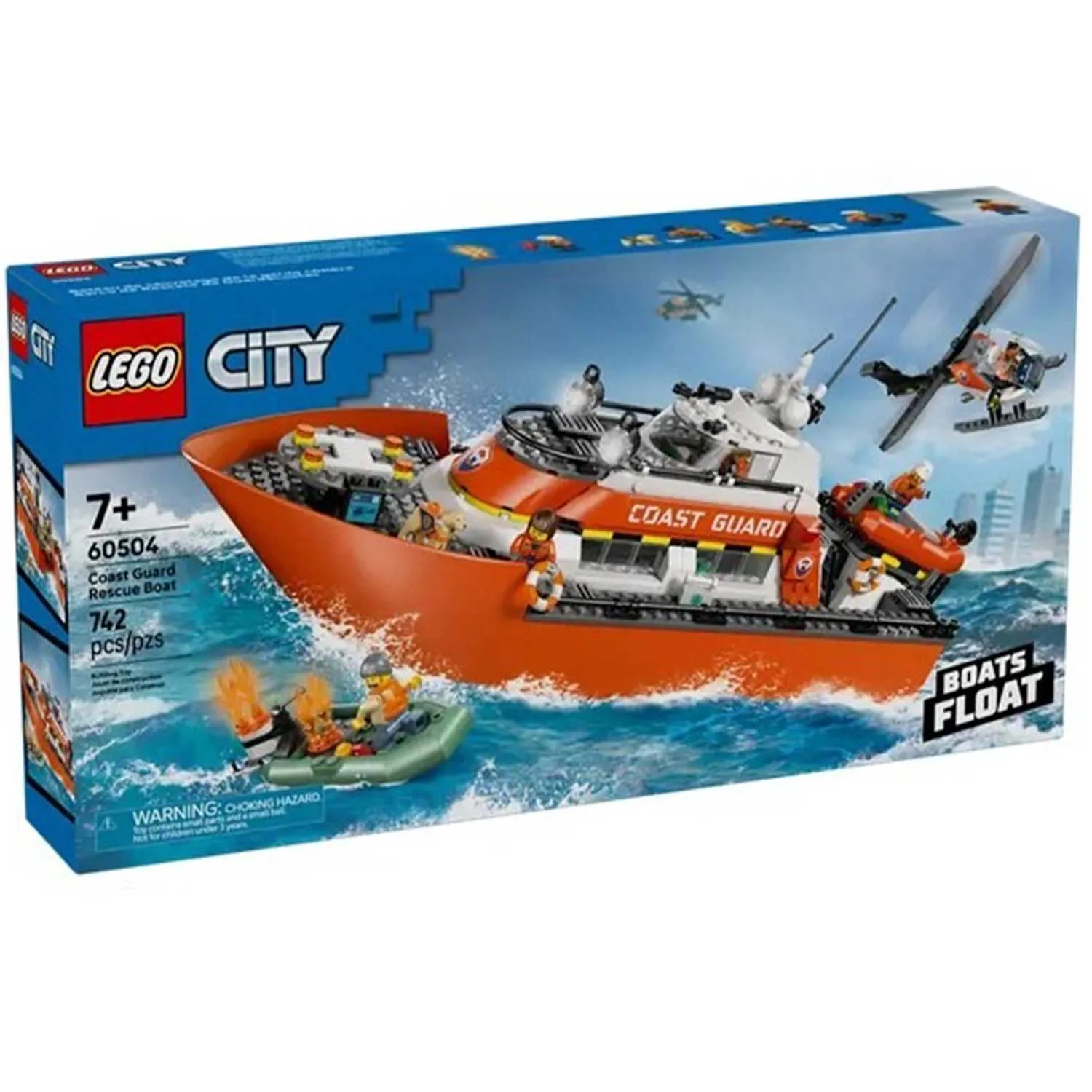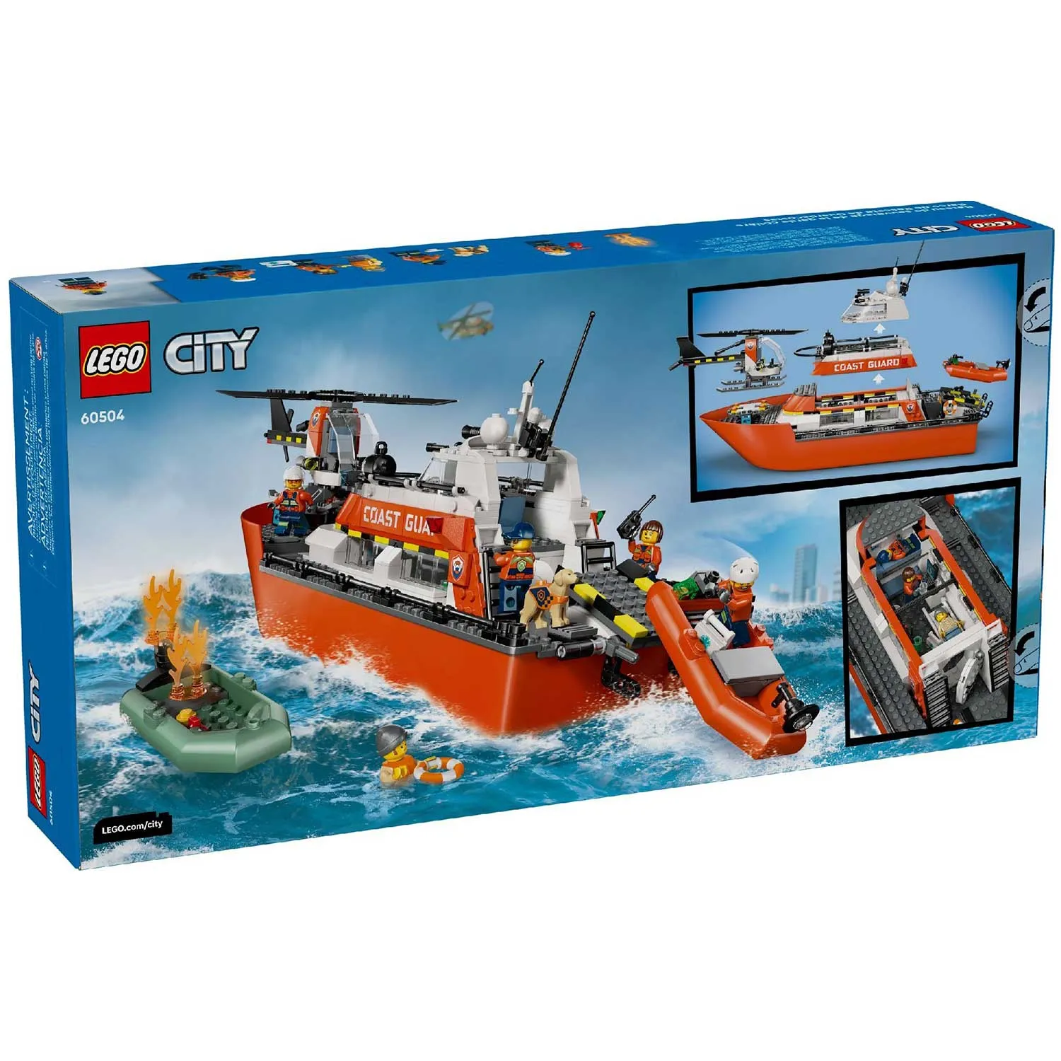 - в набор входит все необходимое для сборки плавучего патрульного катера береговой охраны LEGO, игрушечного спасательного вертолета и 2 плавучих лодок