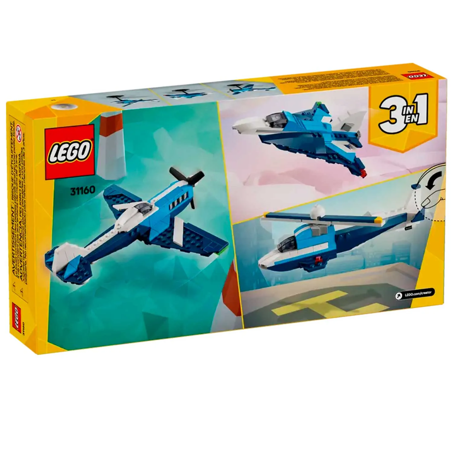 - три модели в одном наборе: гоночный самолёт, реактивный истребитель или вертолёт