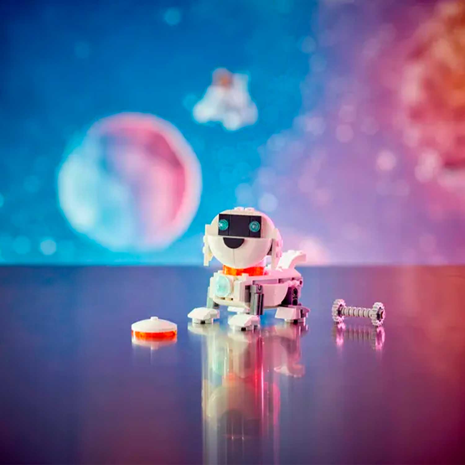 - с помощью набора можно собрать три разных модели: игрушечного космического робота, фигурку космической собаки или игрушечную космическую ракету