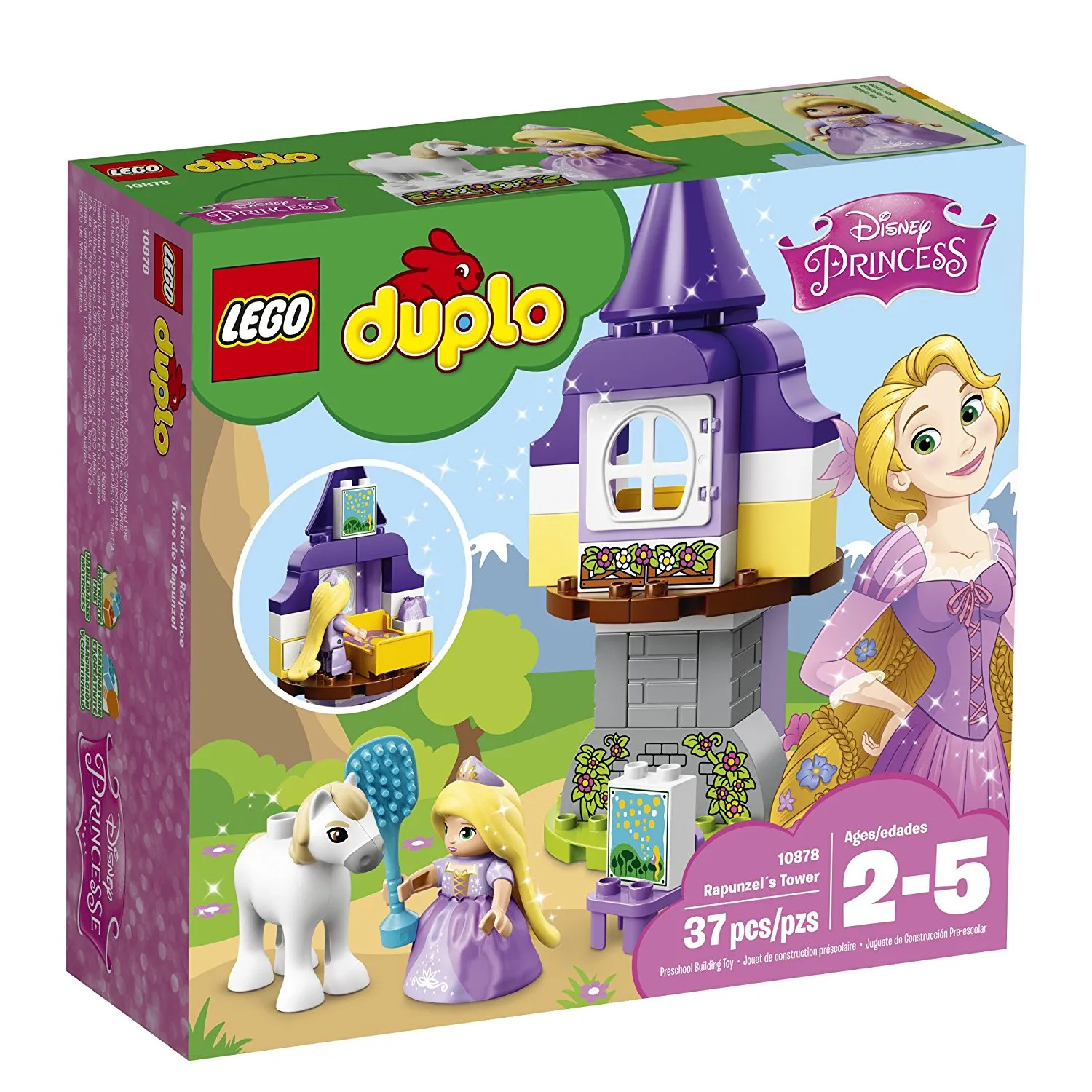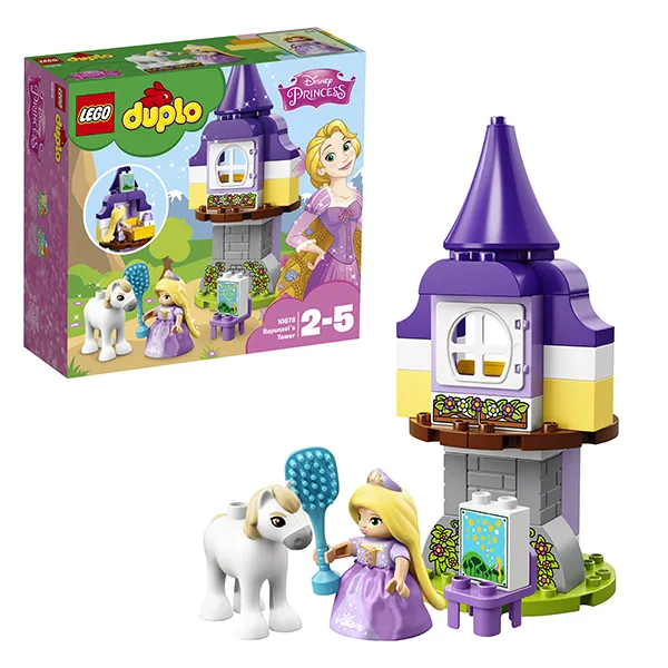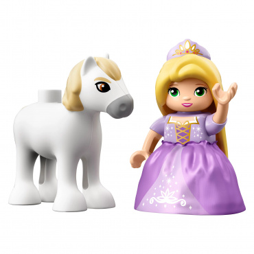 Конструктор состоит из башни с одним окном, минифигурки Рапунцель, верного друга принца – коня Максимуса, а также расчёски для волос и небольшого стула. Вместе с ними можно воссоздать много различных сюжетов из мультфильма или придумать свою собственную оригинальную историю.