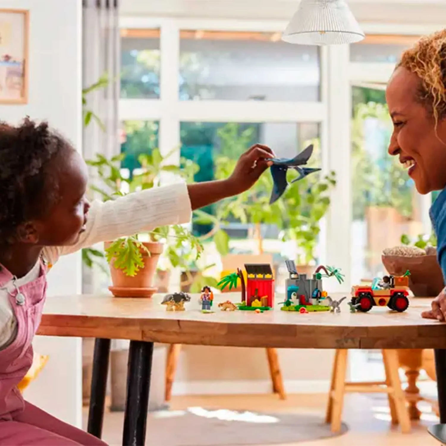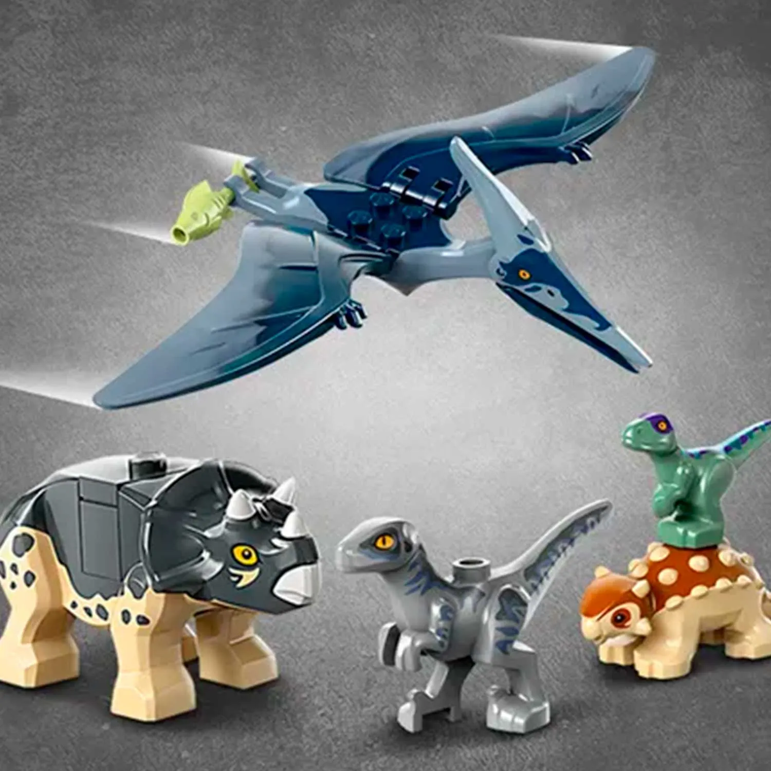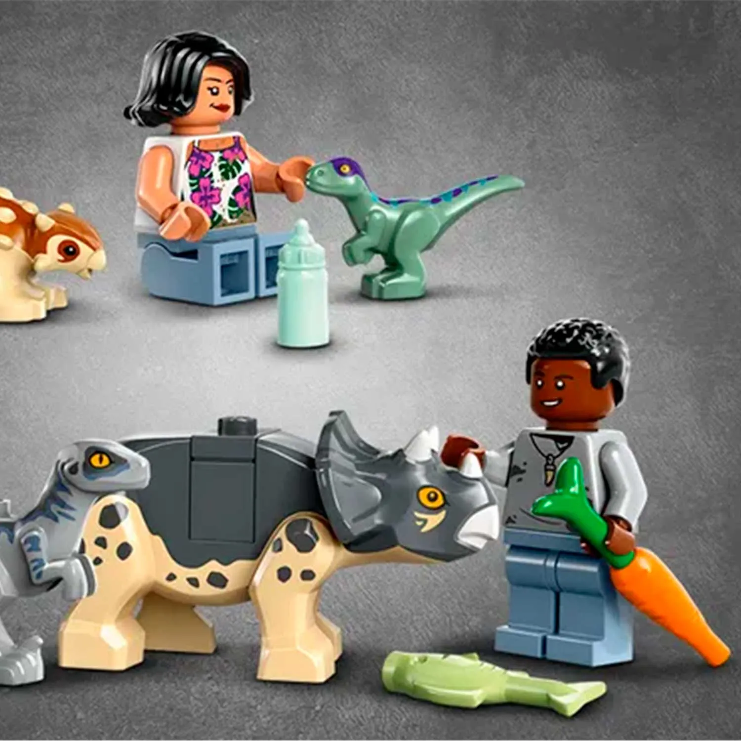 - в игровом наборе Лего 76963 Парк Юрского периода "Центр помощи детёнышам динозавров" 5 фигурок динозавров, включая детенышей анкилозавра, трицератопса и велоцираптора, маленького велоцираптора и взрослого птеранодона, а также минифигурки Дария и Сэмми
