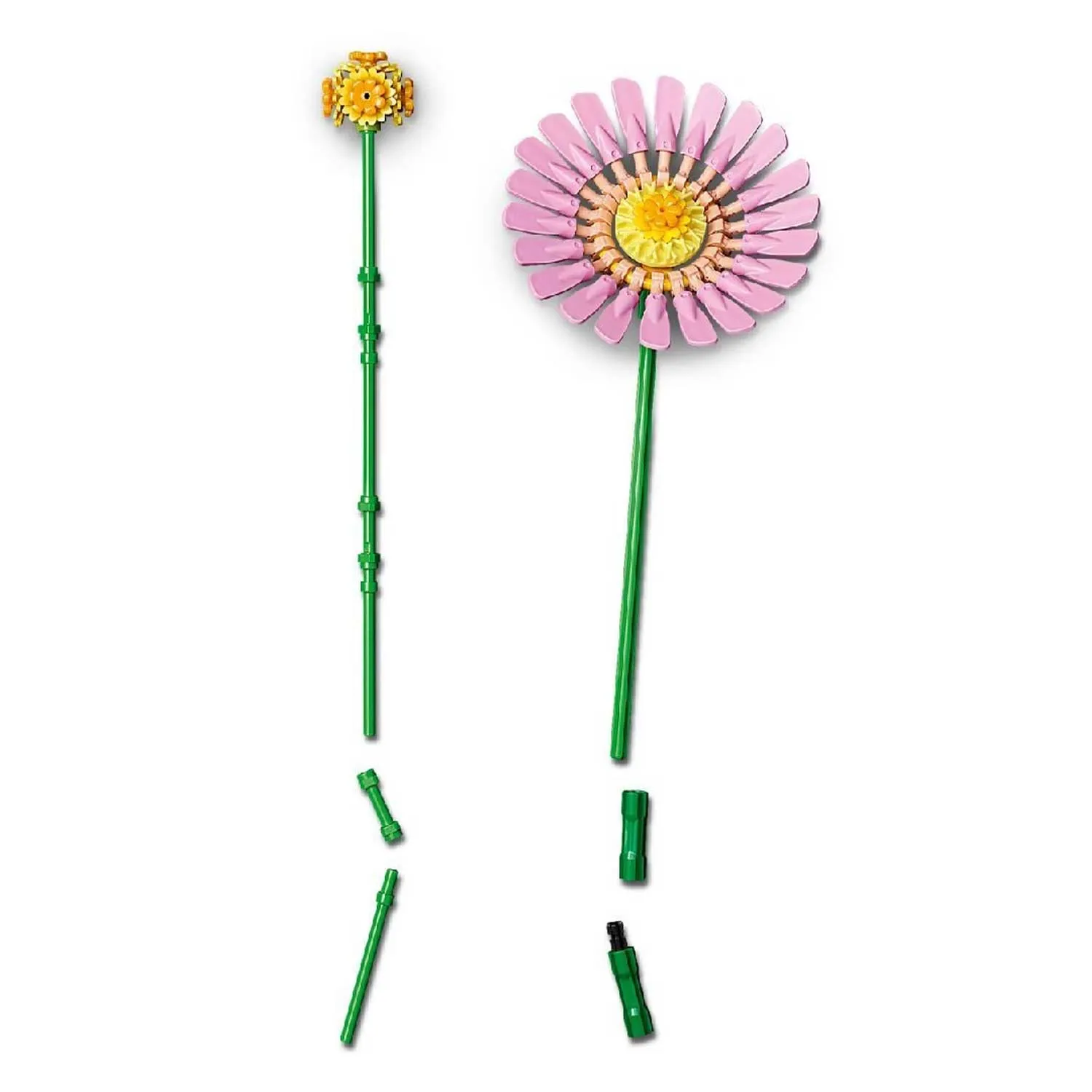 - 7 видов LEGO-цветов: в набор входят билли-баттоны, колокольчики, папоротники Клеопатры, жёлтый тысячелистник, розовая гербера, пион и тюльпан