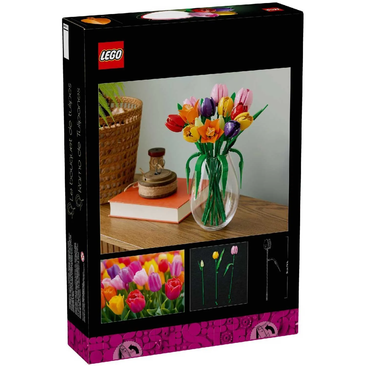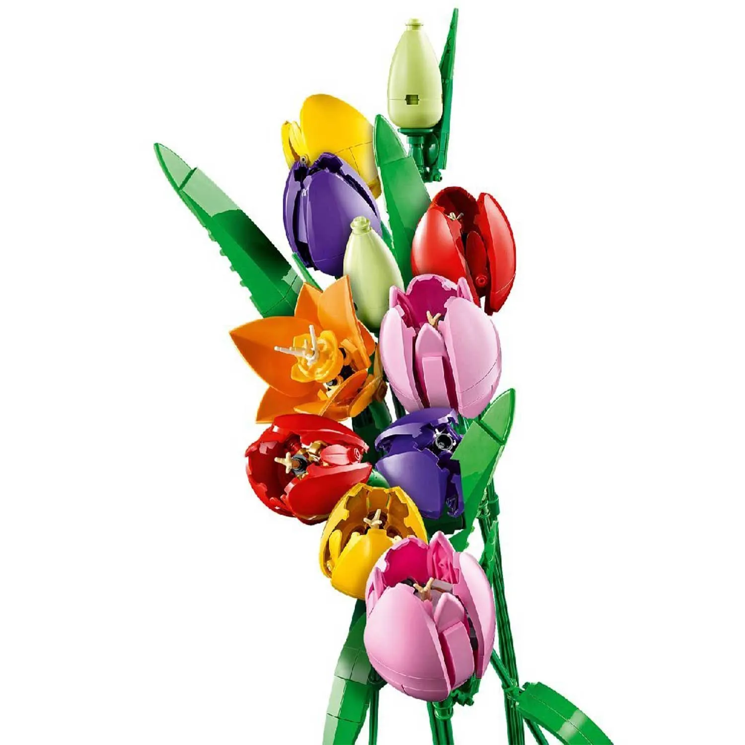 - букет из 5 тюльпанов LEGO – включает 5 сортов тюльпанов разных цветов и стадий цветения: зеленые бутоны, фиолетовые закрытые тюльпаны, а также красные, желтые и розовые распустившиеся тюльпаны