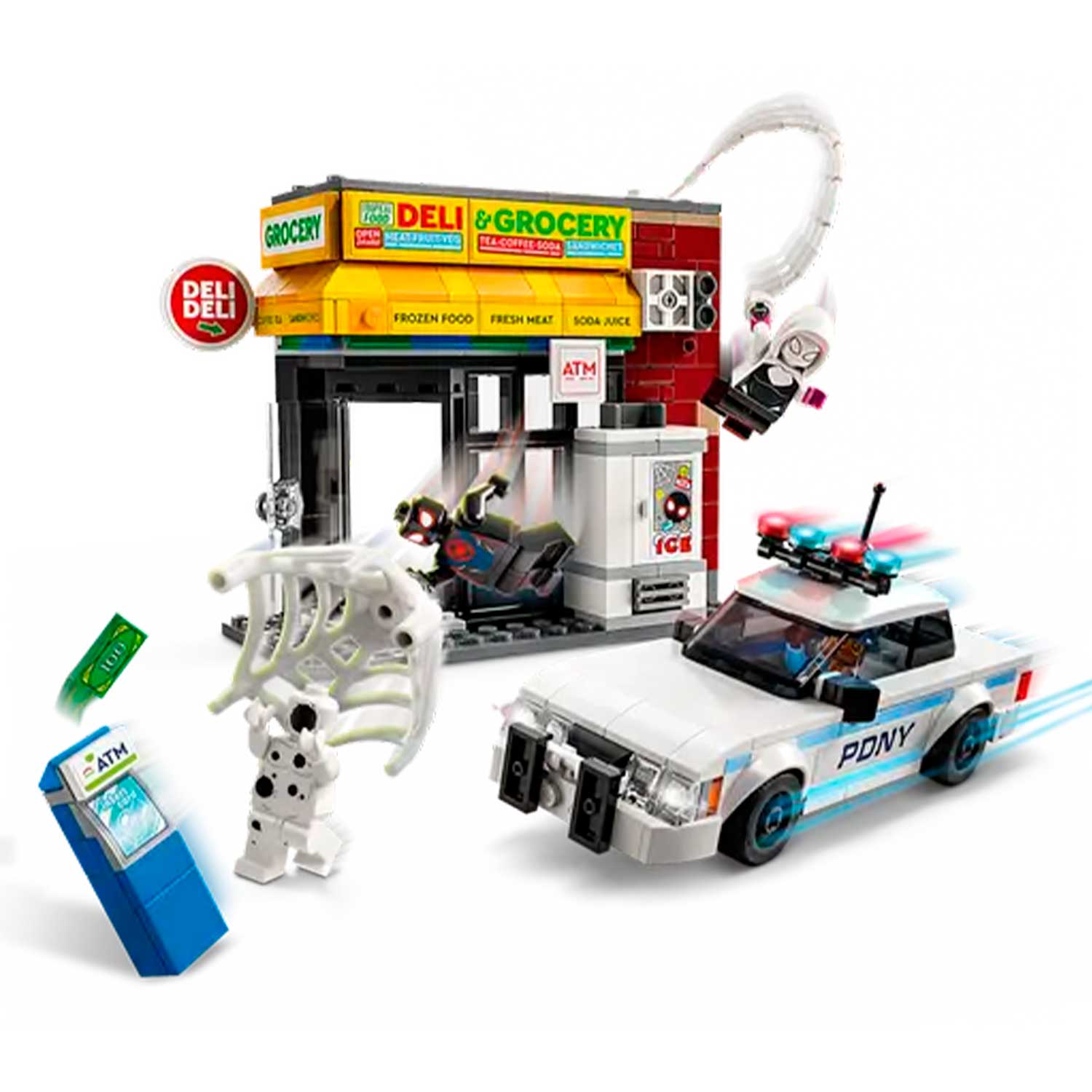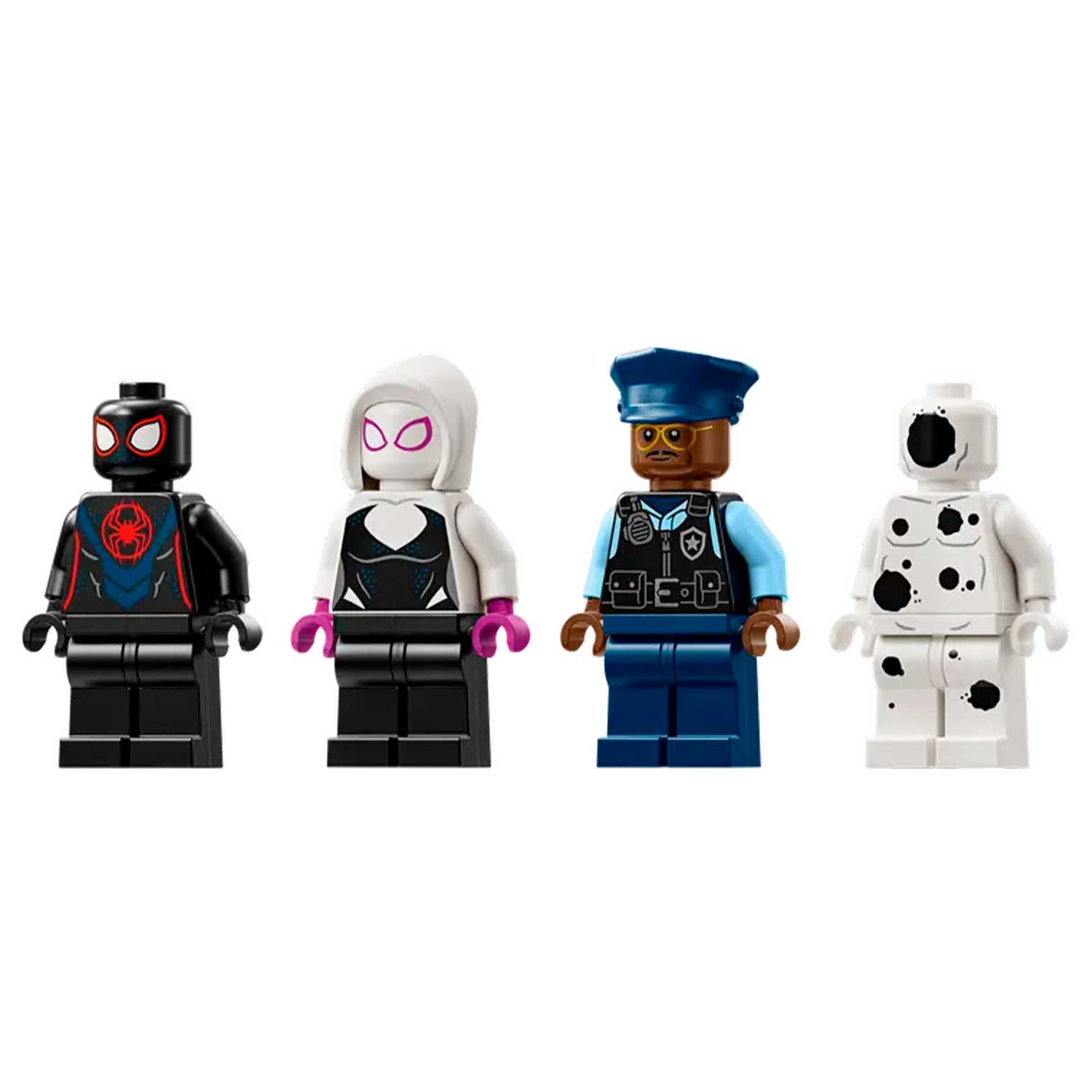 - 4 минифигурки LEGO Marvel: Майлз Моралес, Спот, Гвен Стейси и офицер Джефферсон, а также аксессуары, включая длинную гибкую веревку-паутину и гибкую паутину, которая достаточно велика, чтобы поместить минифигурку