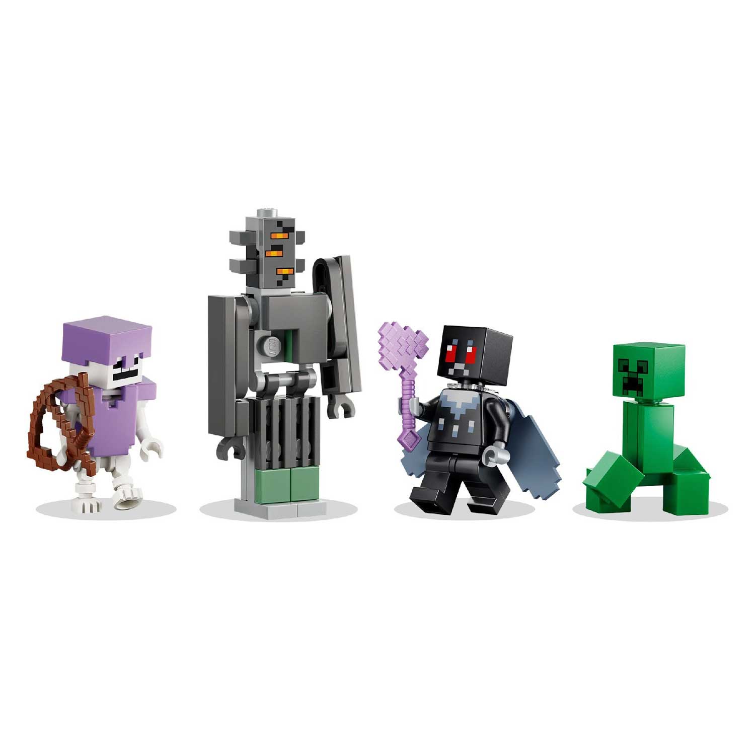 - набор включает множество аксессуаров: зачарованный топор, лук, сундук для хранения, костер, свиную отбивную, крылья элитры, алмазную броню и комки смолы