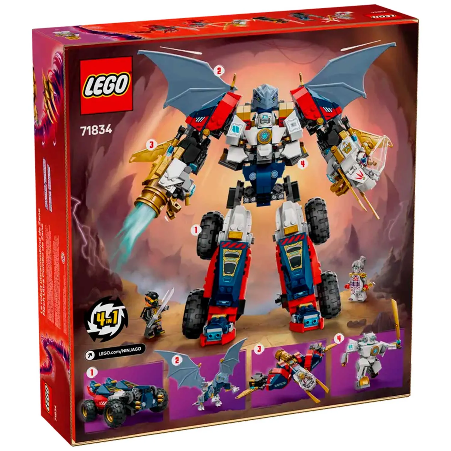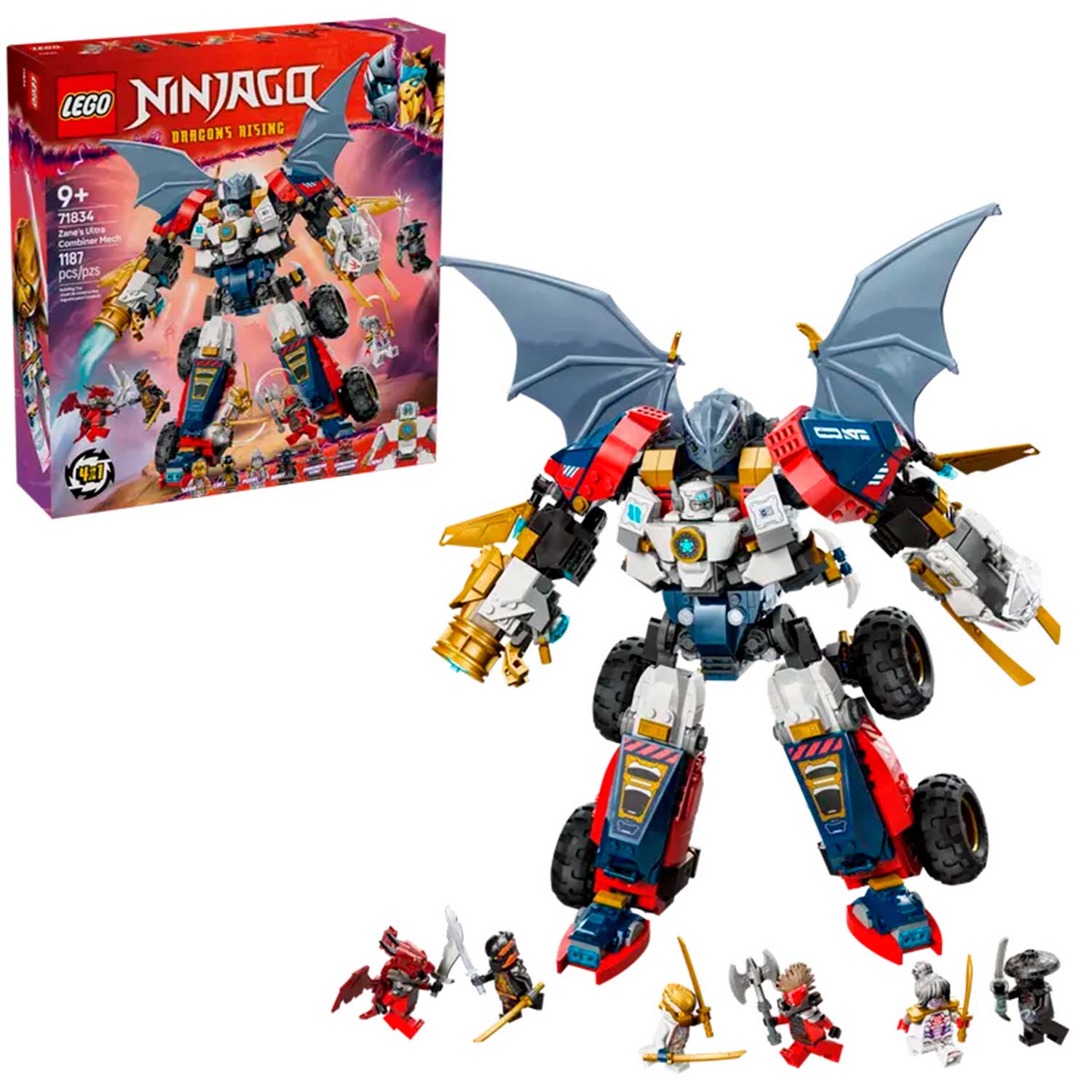 - мех разбирается на 4 модели: реактивный самолет с подвижными двигателями и вращающейся кабиной; автомобиль с 4 большими внедорожными колесами и 2 открывающимися кабинами, в том числе одна со скрытыми бластерами; фигурку дракона с подвижными частями и крыльями и фигурку Зейна