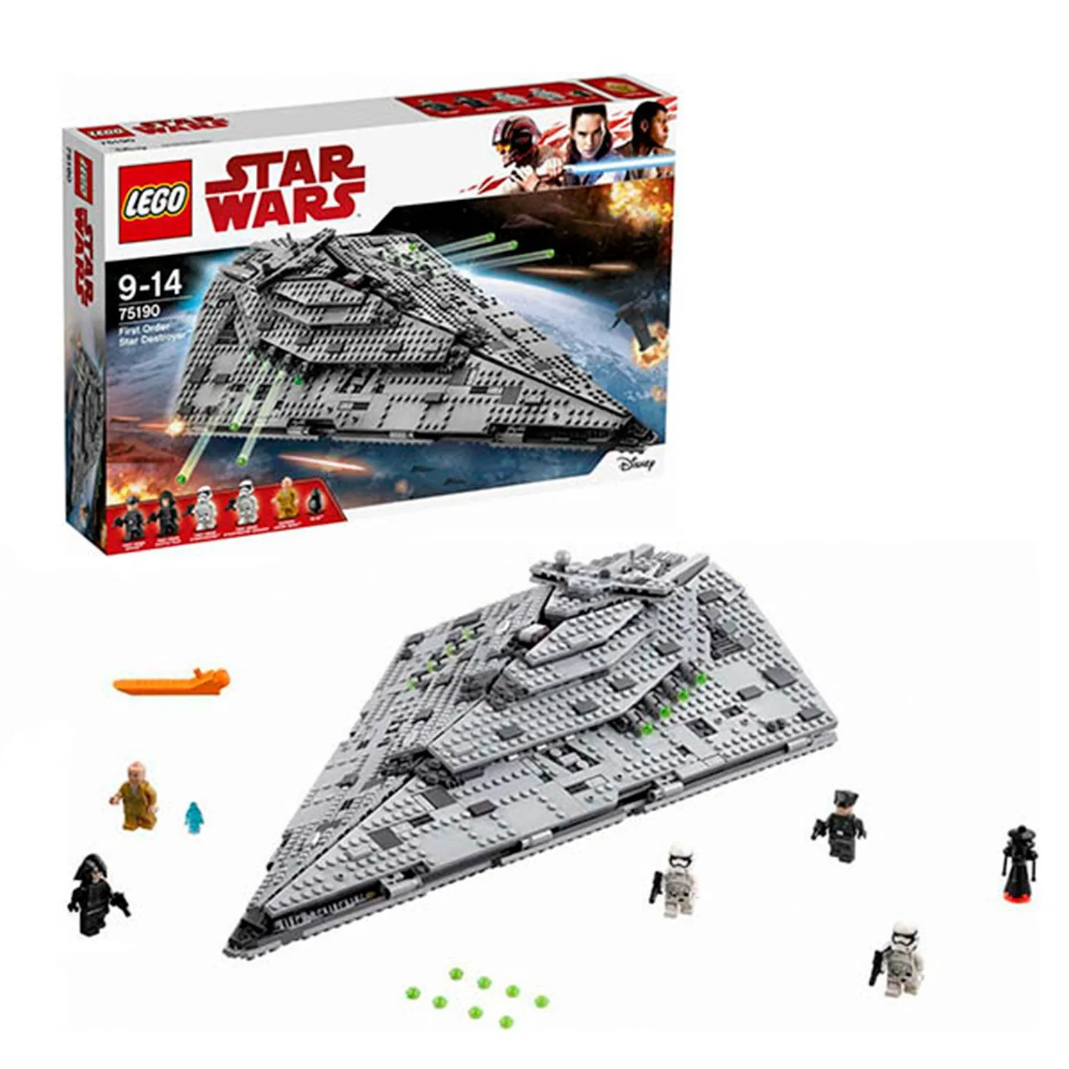 - деталей 1416 шт- шесть мини-фигурок – офицер Первого Ордена, пилот шаттла, рядовой штурмовик, штурмовик-сержант Первого Ордена, Верховный лидер Первого Ордена Сноук, микро-фигурка дроида-астромеханика BB-9E