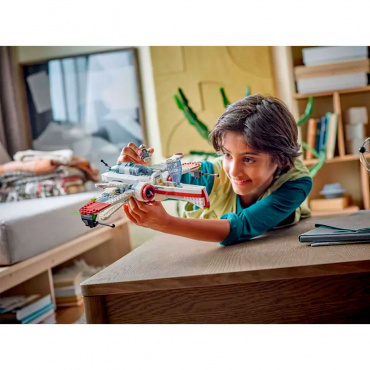 - этот сборный звездный истребитель имеет 3 открывающиеся кабины, 6 крыльев, включая 4 регулируемых крыла с рычагом для режимов атаки и крейсерского полета, а также 2 пружинных шутера