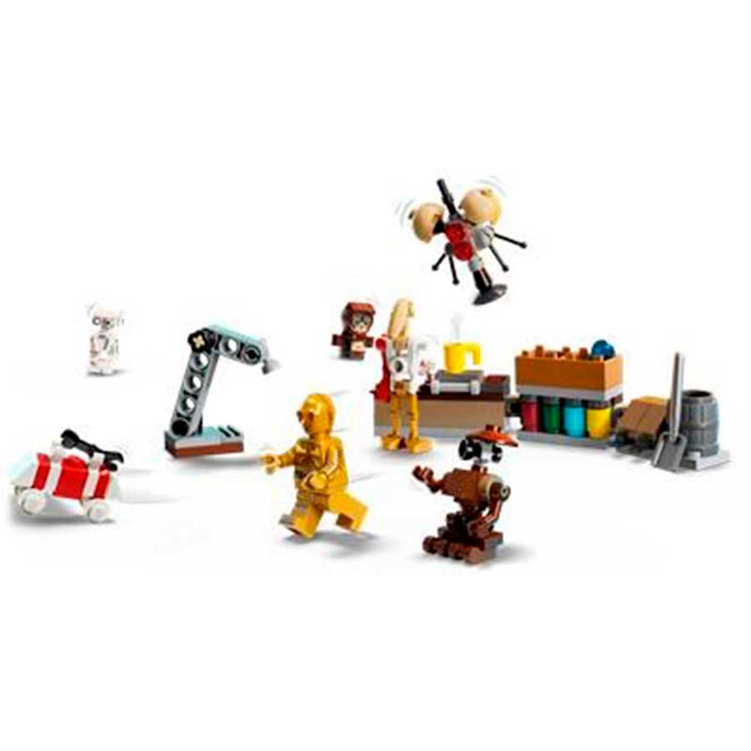 - 9 мини-игрушек для сборки: верстак, стул, стойка для инструментов, полки, коробка с дополнительными деталями для дроидов, кран и ведро для создания мастерской дроида, а также сборный автомобиль Джава и рождественская елка