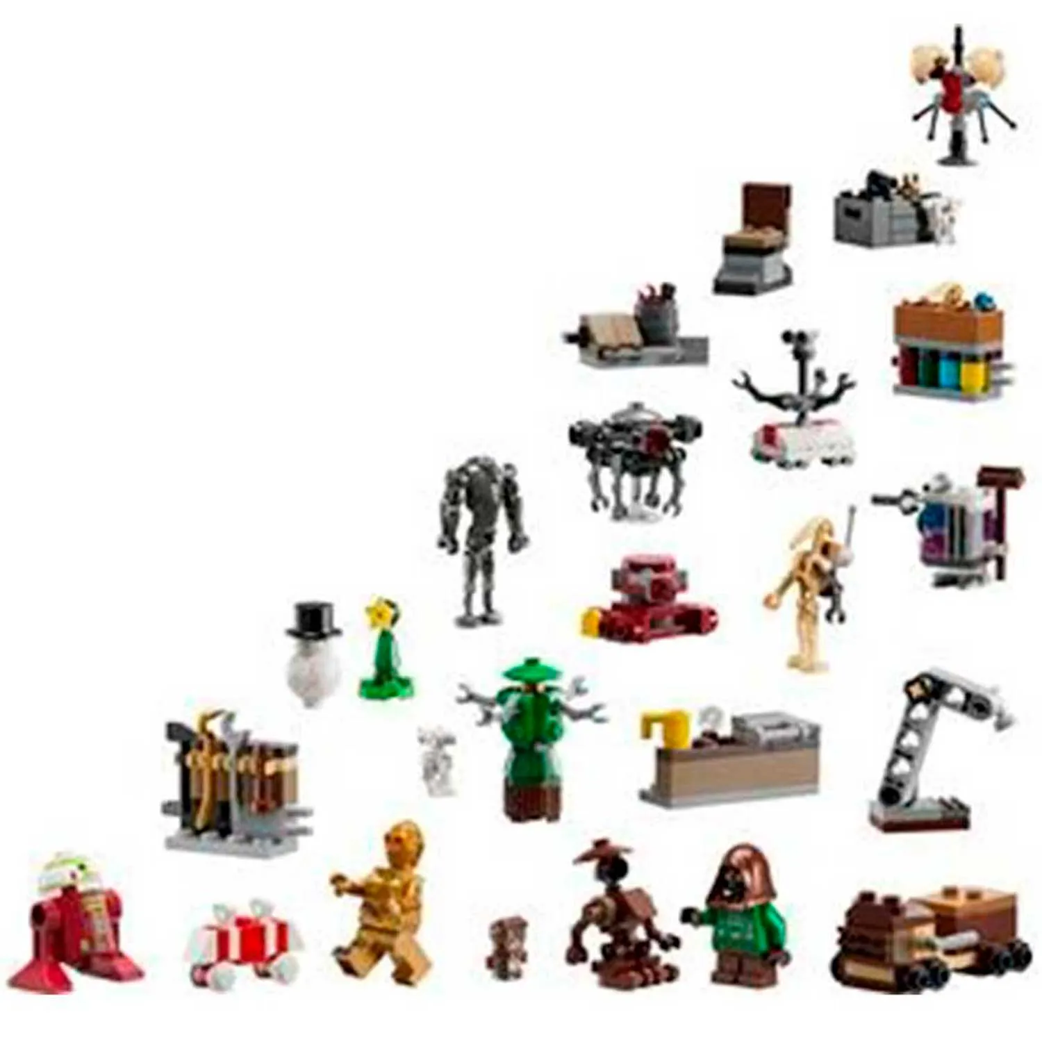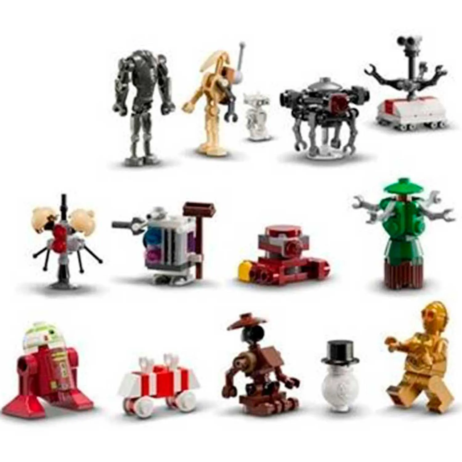 - 8 сборных дроидов LEGO: дроид-питборд, дроид-гонк, дроид-баззз, медицинский дроид (праздничный), B2EMO, дроид Тредвелла, дроид-мышь (праздничный) и зонд-дроид;