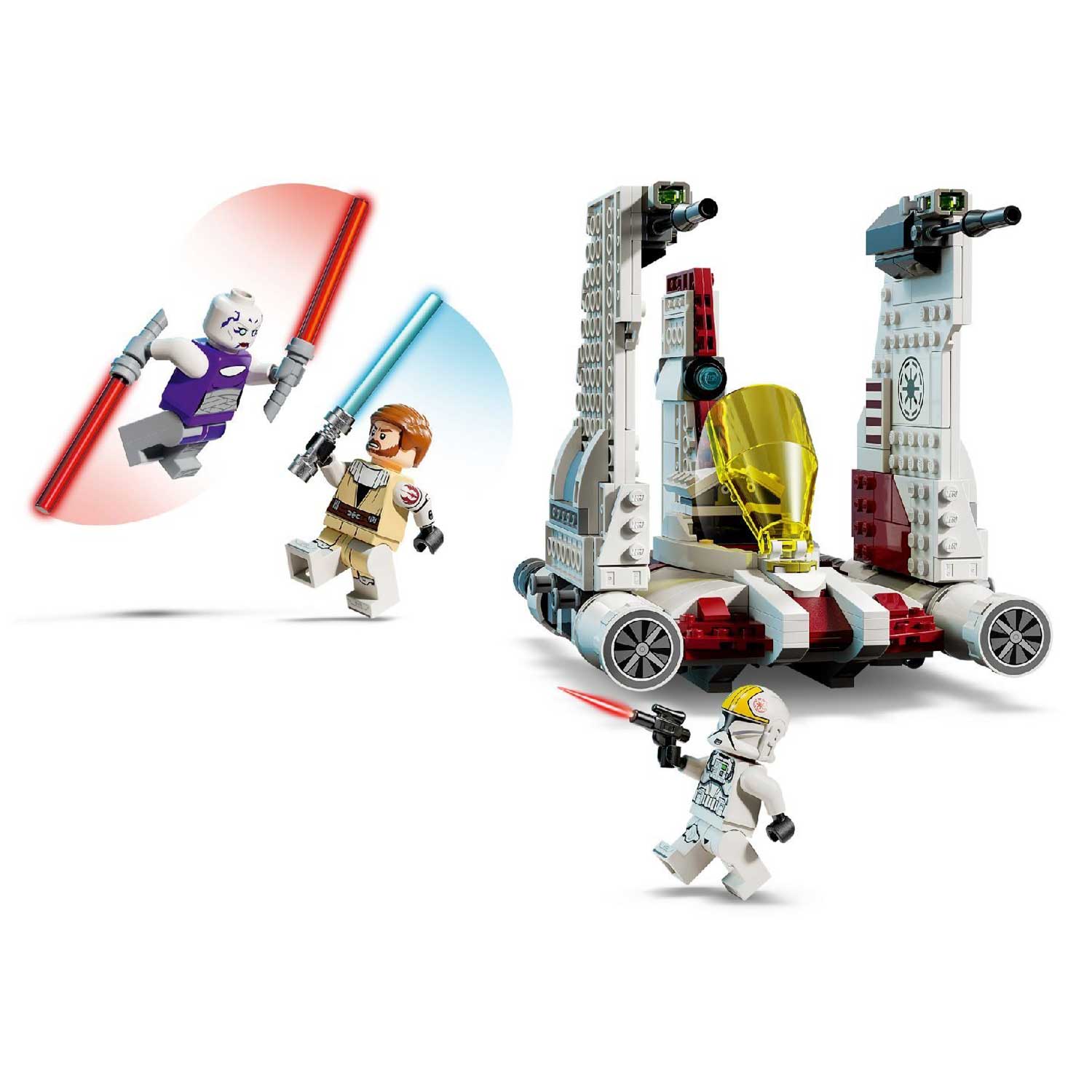 - в набор входят 3 минифигурки LEGO Star Wars: Асажж Вентресс с двумя красными световыми мечами со специальными изогнутыми рукоятками, генерал Оби-Ван Кеноби с синим световым мечом для захватывающих поединков и пилот-клон