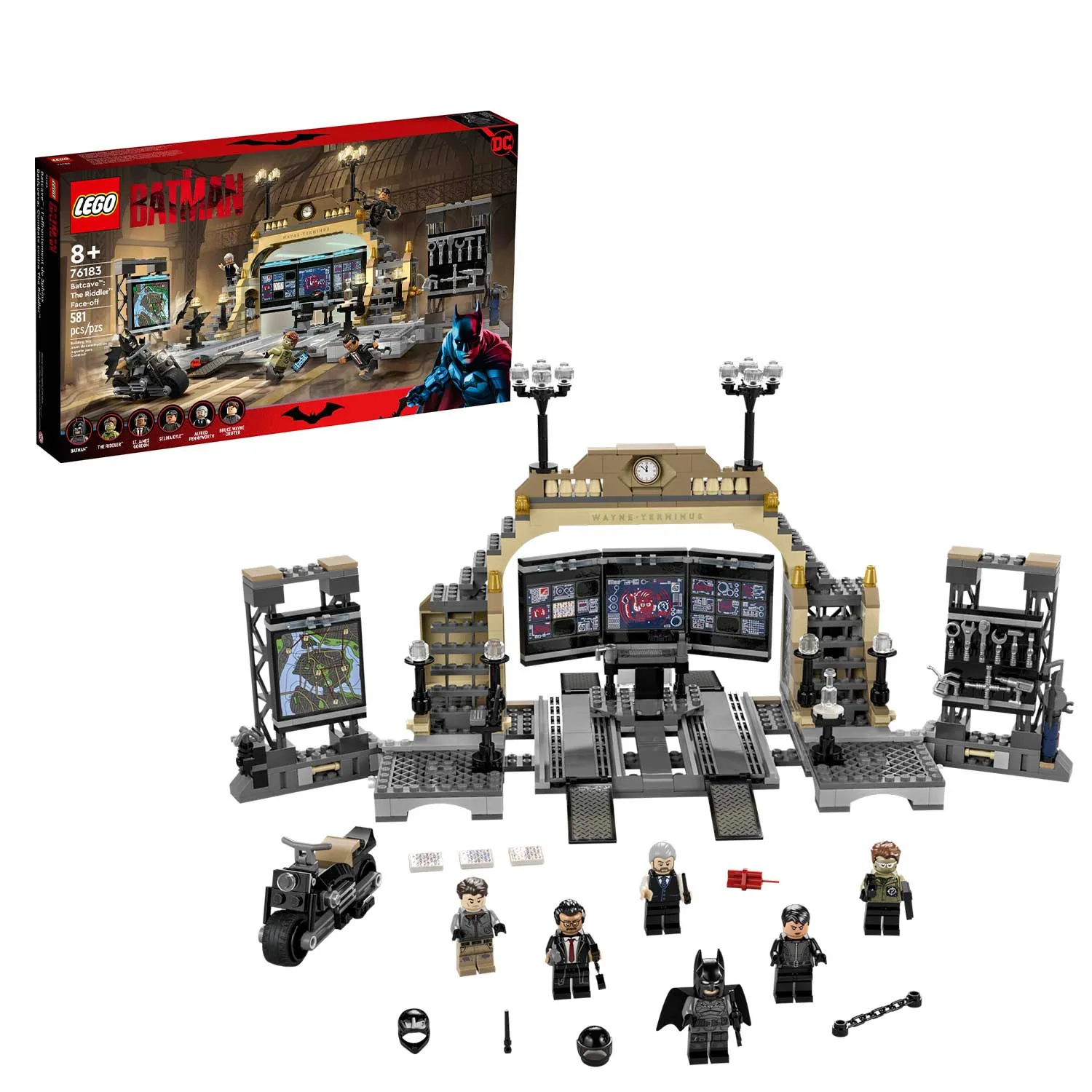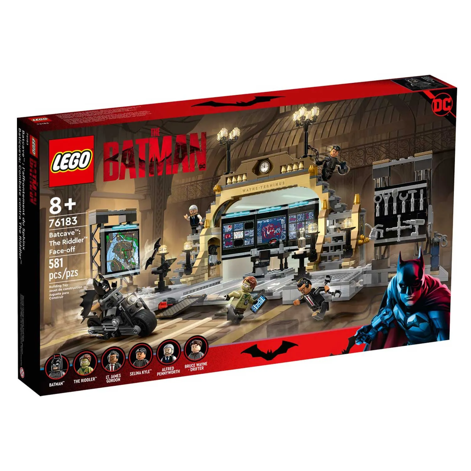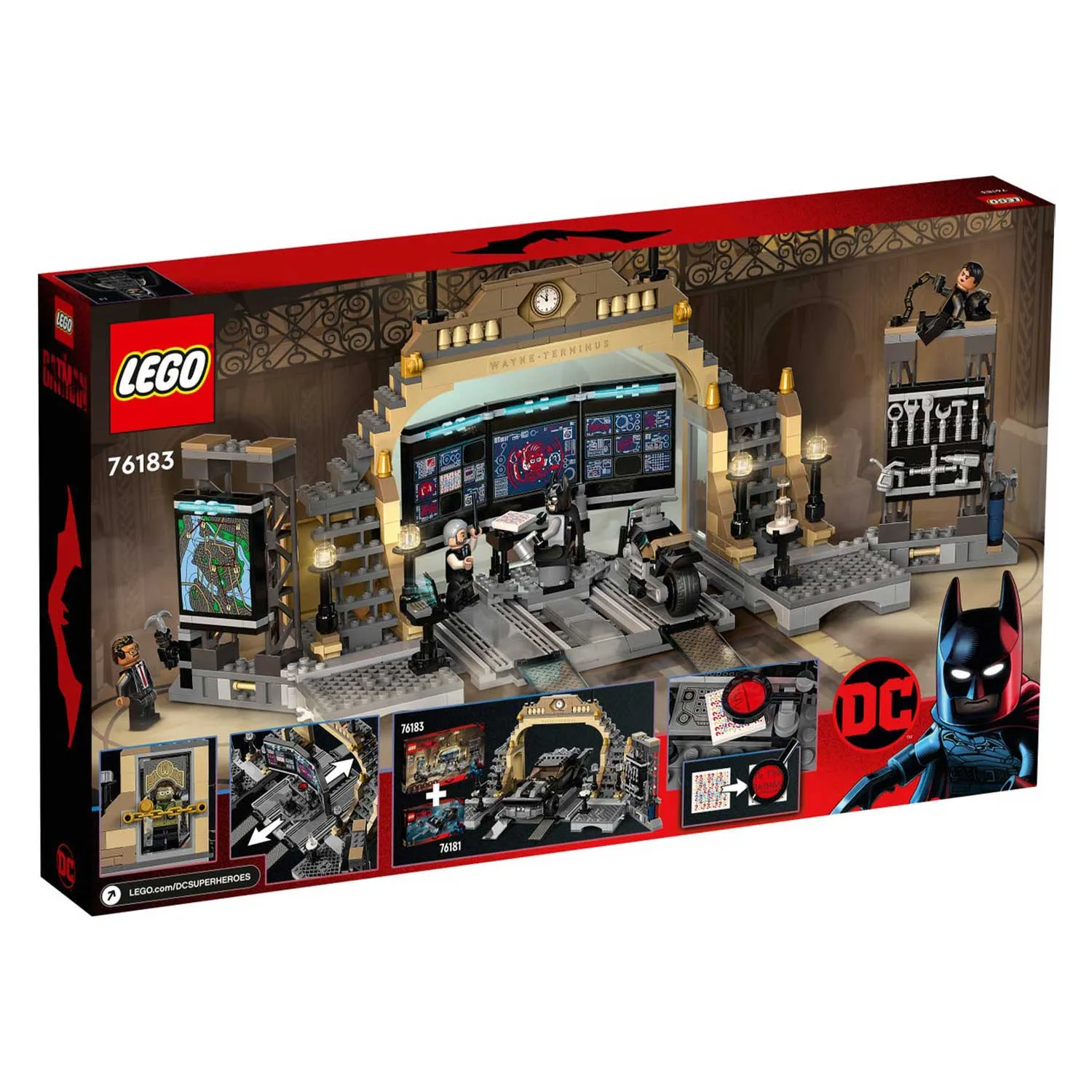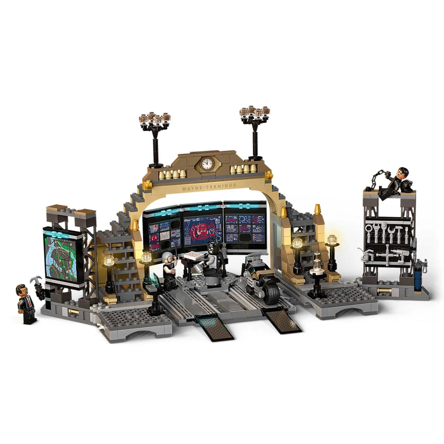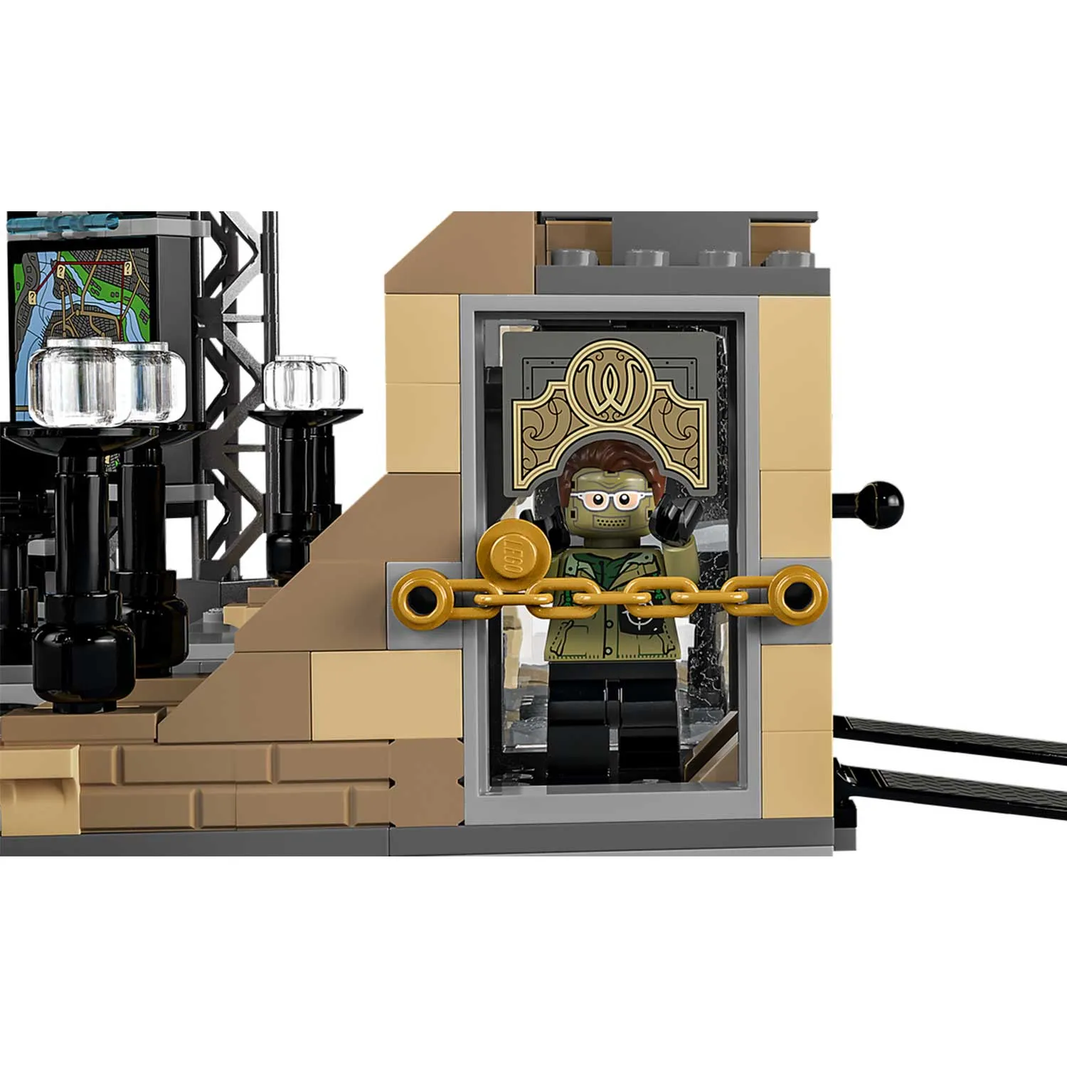 - две стены по бокам, на одной из которых большая карта Готэм-сити, а на второй стеллаж с инструментами, закреплены на петлях, чтобы их можно было поворачивать в разные положения для увеличения игрового пространства