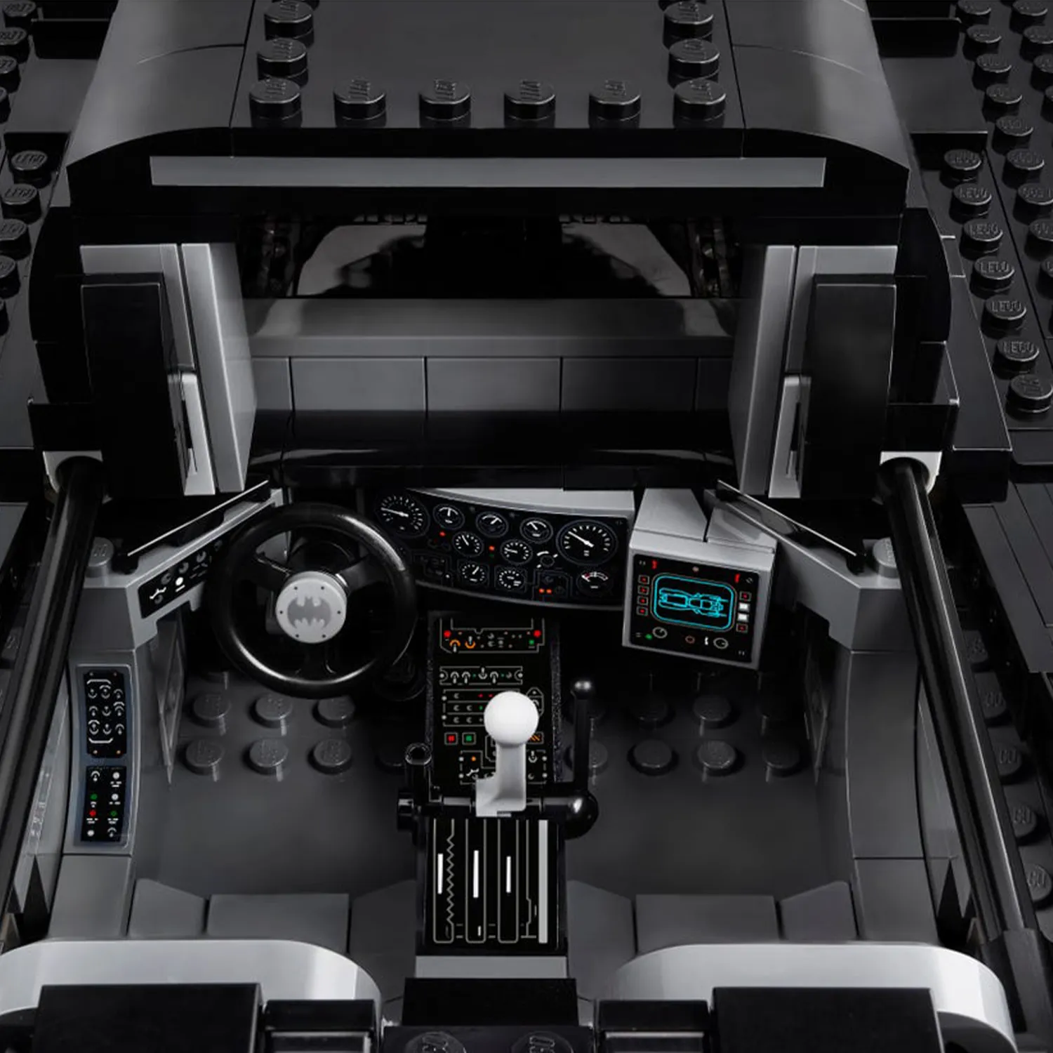 - у сборной модели Бэтмобиля есть кабина с раздвижными дверями и новым круговым ветровым стеклом, два сиденья для мини фигурок, рулевое колесо, стикеры рычага переключения передач и приборной панели, два потайных пулемёта под капотом, которые выдвигаются при повороте выхлопной трубы турбины, два декоративных абордажных крюка, ободы колёс с логотипом летучей мыши и специальные шины для передних колес, крылья летучей мыши и другие культовые детали