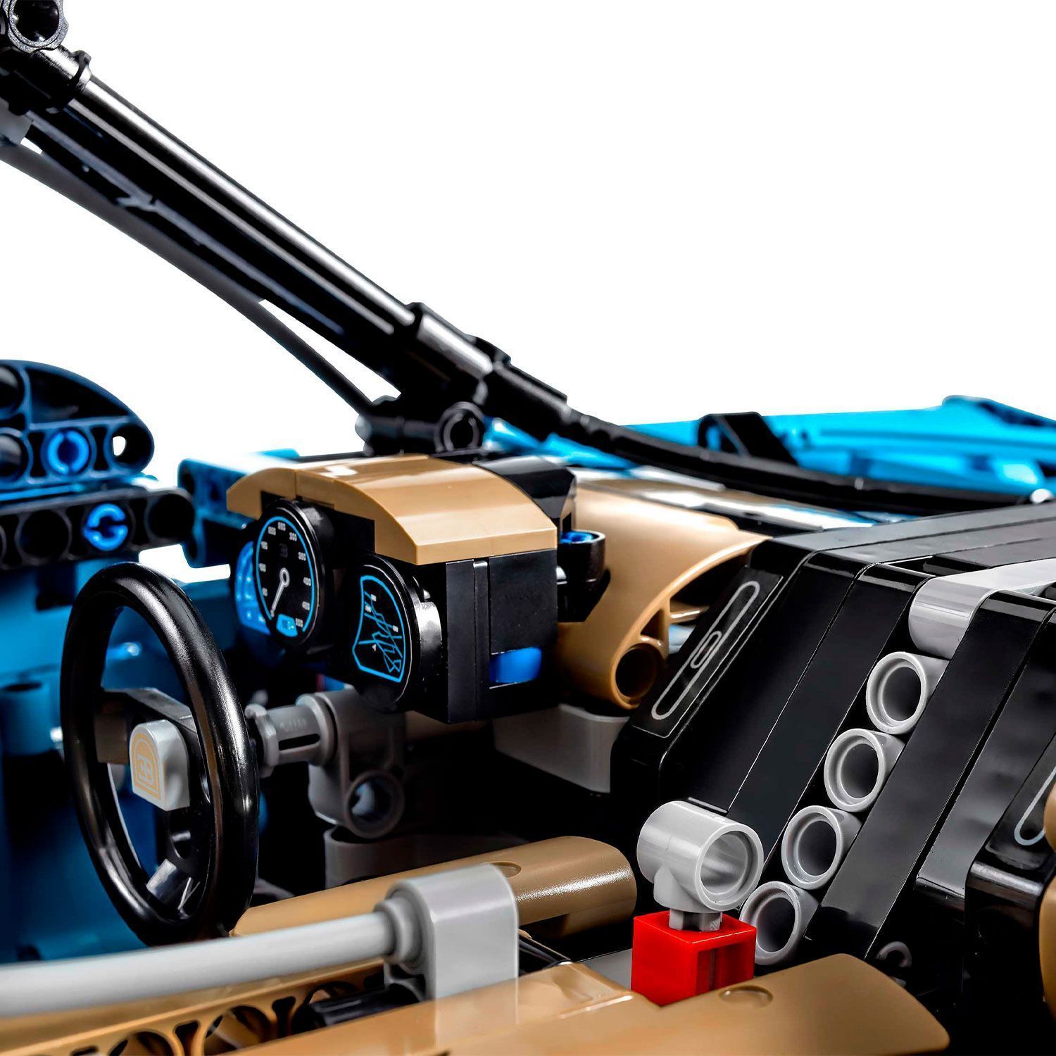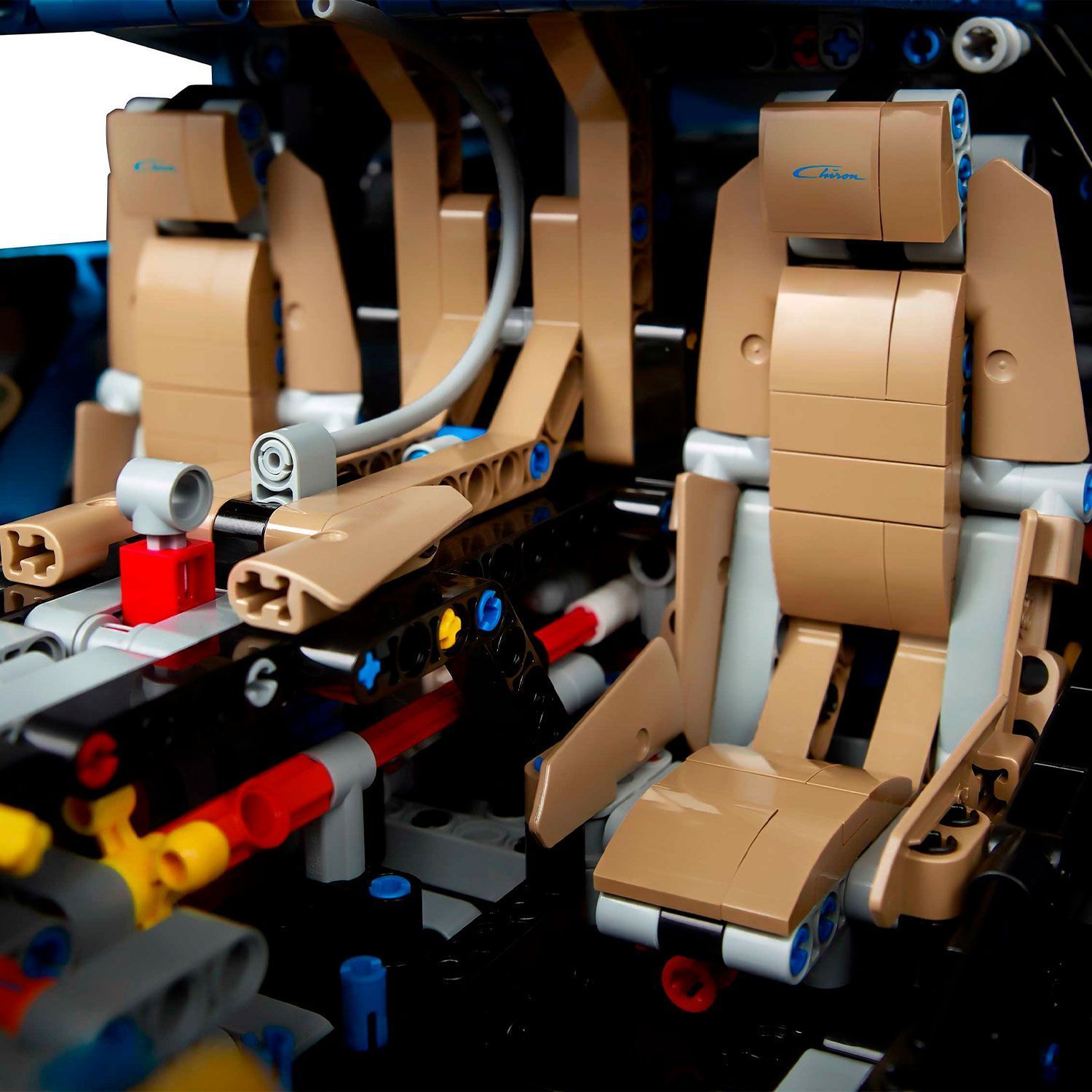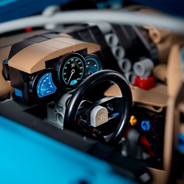 - тщательно проработанный кокпит с селектором 8-ступенчатой коробки передач Technic, подрулевыми лепестками и рулем с логотипом Bugatti