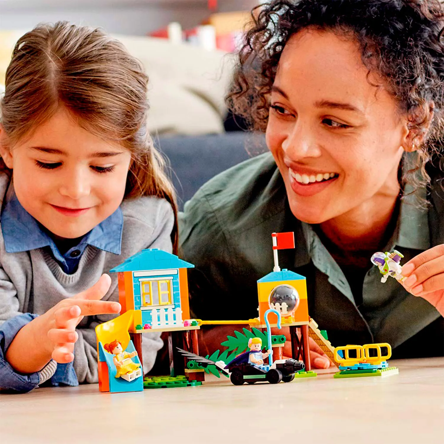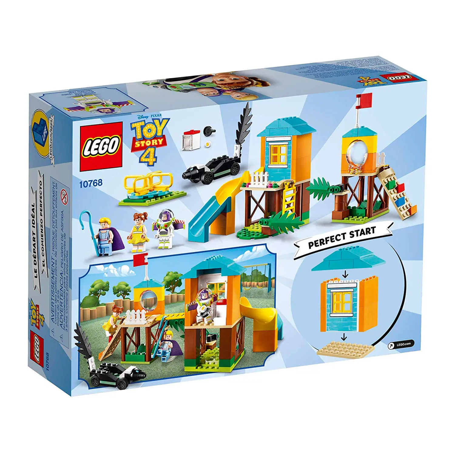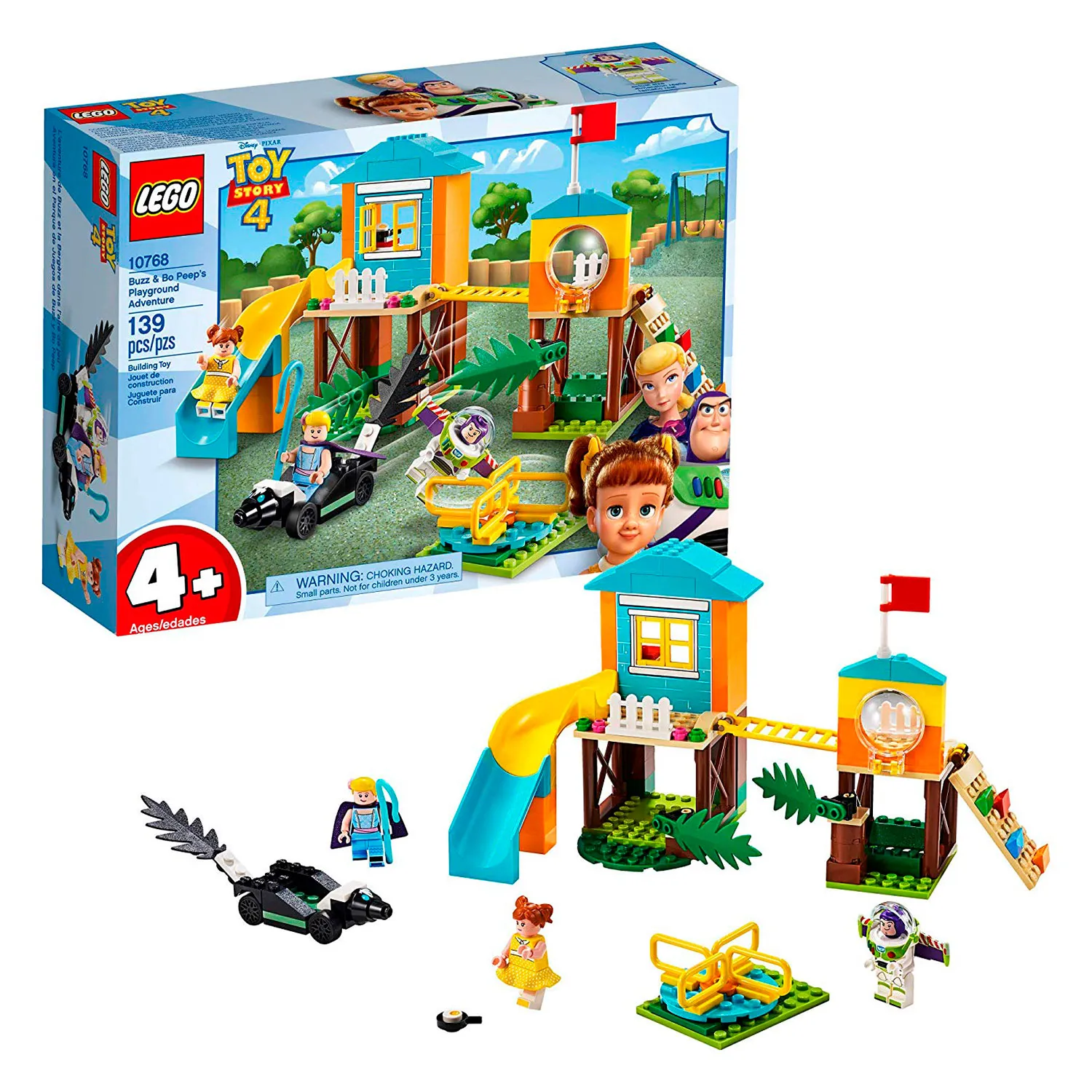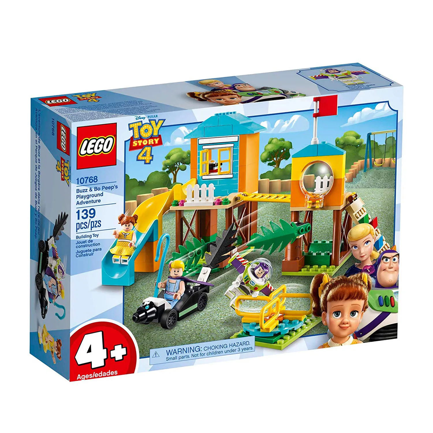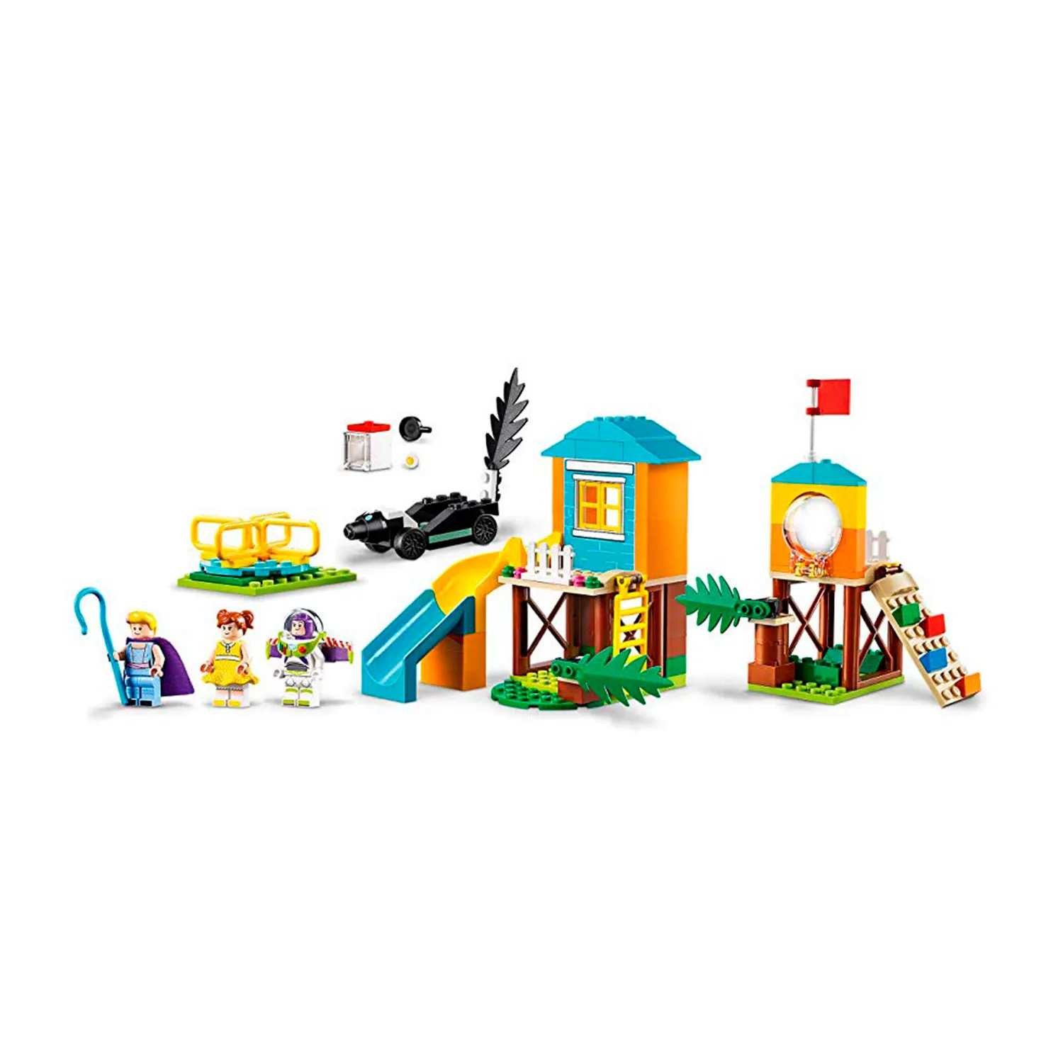 Конструктор Лего Приключения Базза и Бо Пип на детской площадке включает сразу несколько игровых элементов. Ты можешь повеселиться вместе с героями мультфильма История игрушек 4 в домике с горкой и стеной для скалолазанья, прокатиться на карусели или скунсомобиле.