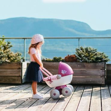 Коляска от компании «Smoby» имеет привлекательный дизайн, выполнена в фиолетовом цвете с серыми колесиками.