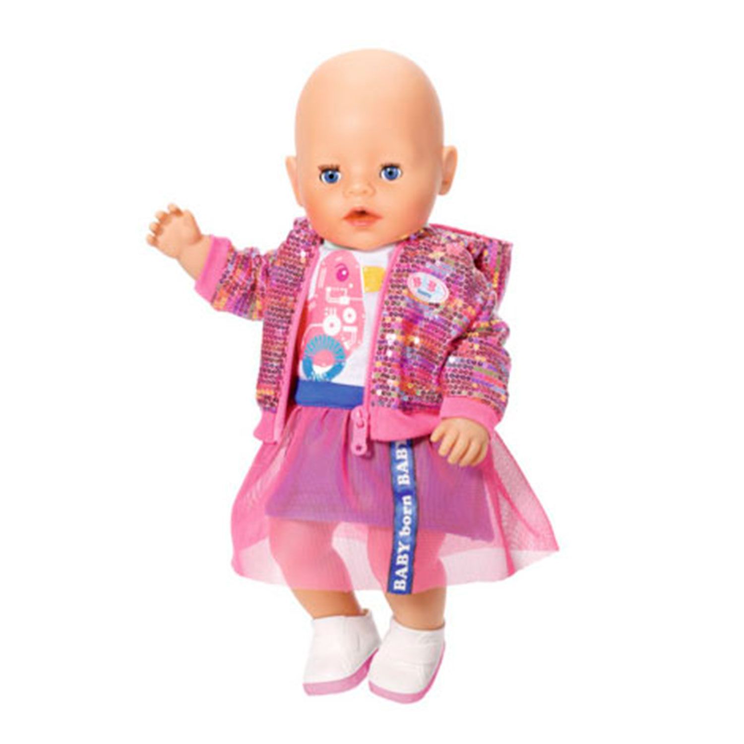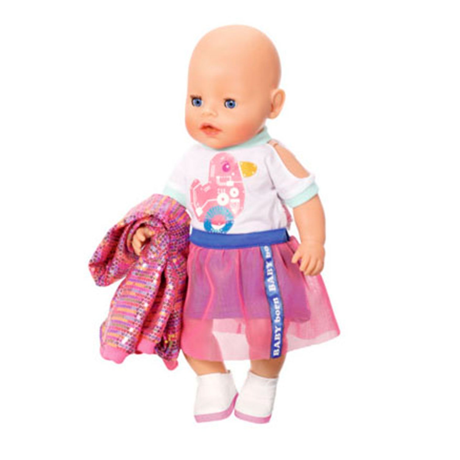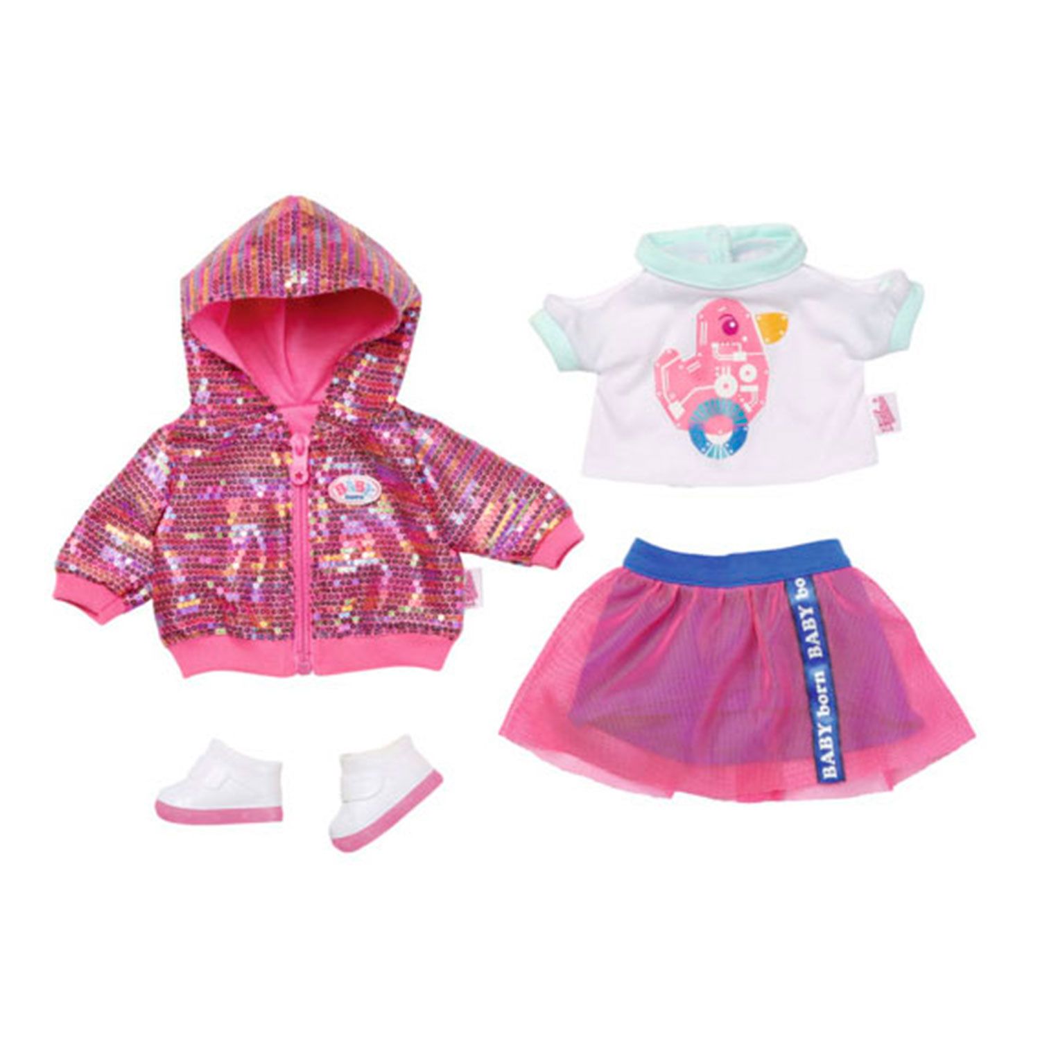 Состоит из куртки с капюшоном на молнии и розовыми пайетками, белой футболки с аппликацией на груди, юбки с тюлевой накладкой и белых ботиночек.