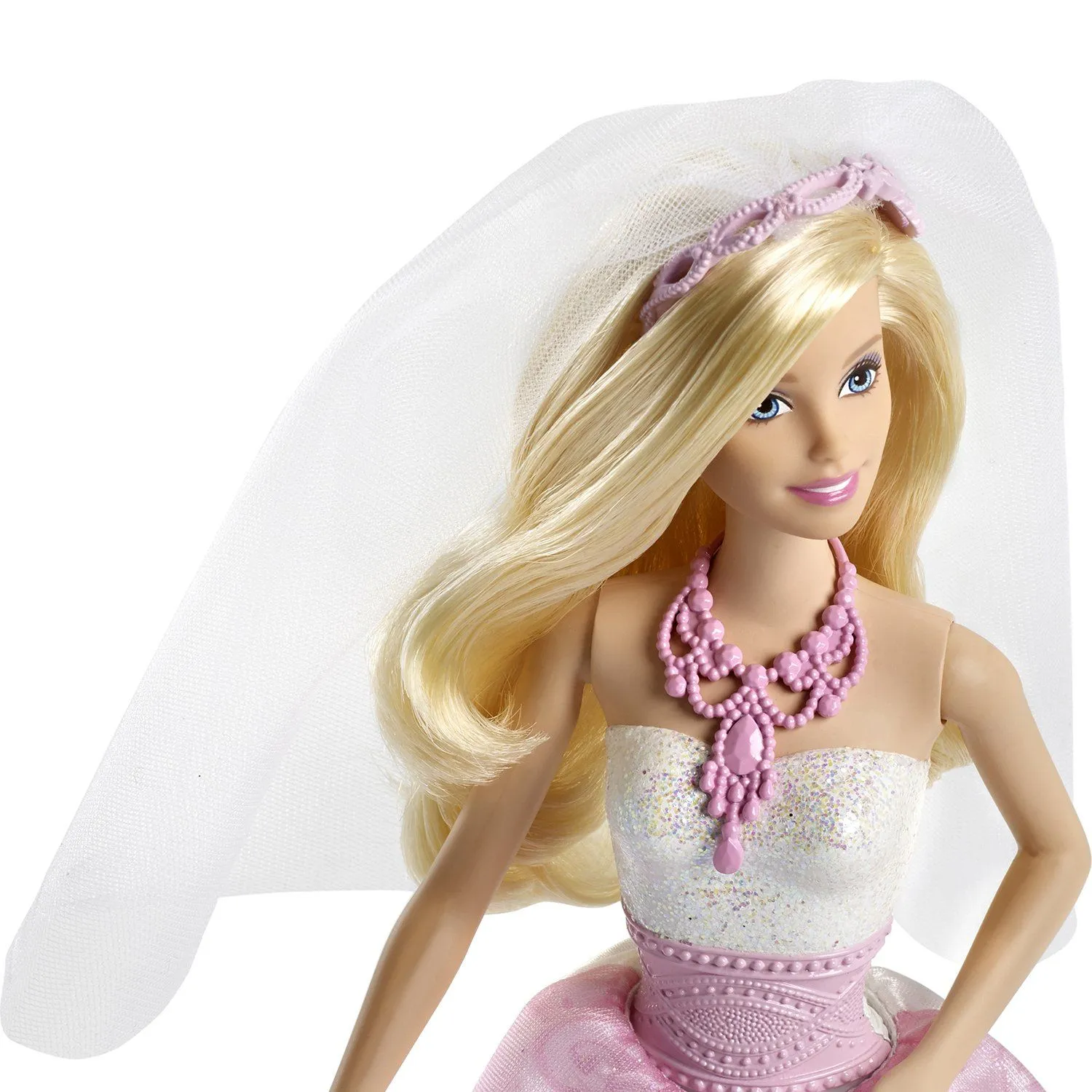 - верхняя часть платья это пластиковый корсет, часть которого обильно украшена нежными переливающимися блестками, а средняя часть создана в виде узорного розового пояса