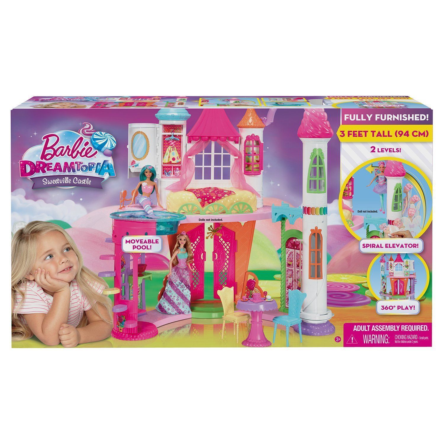 Игровой домик для Барби Dreamtopia "Конфетный дворец" от компании Mattel представляет собой большой двухэтажный замок, заполненный яркими предметами и украшенный различными штрихами, такими как резные окна и башенки.