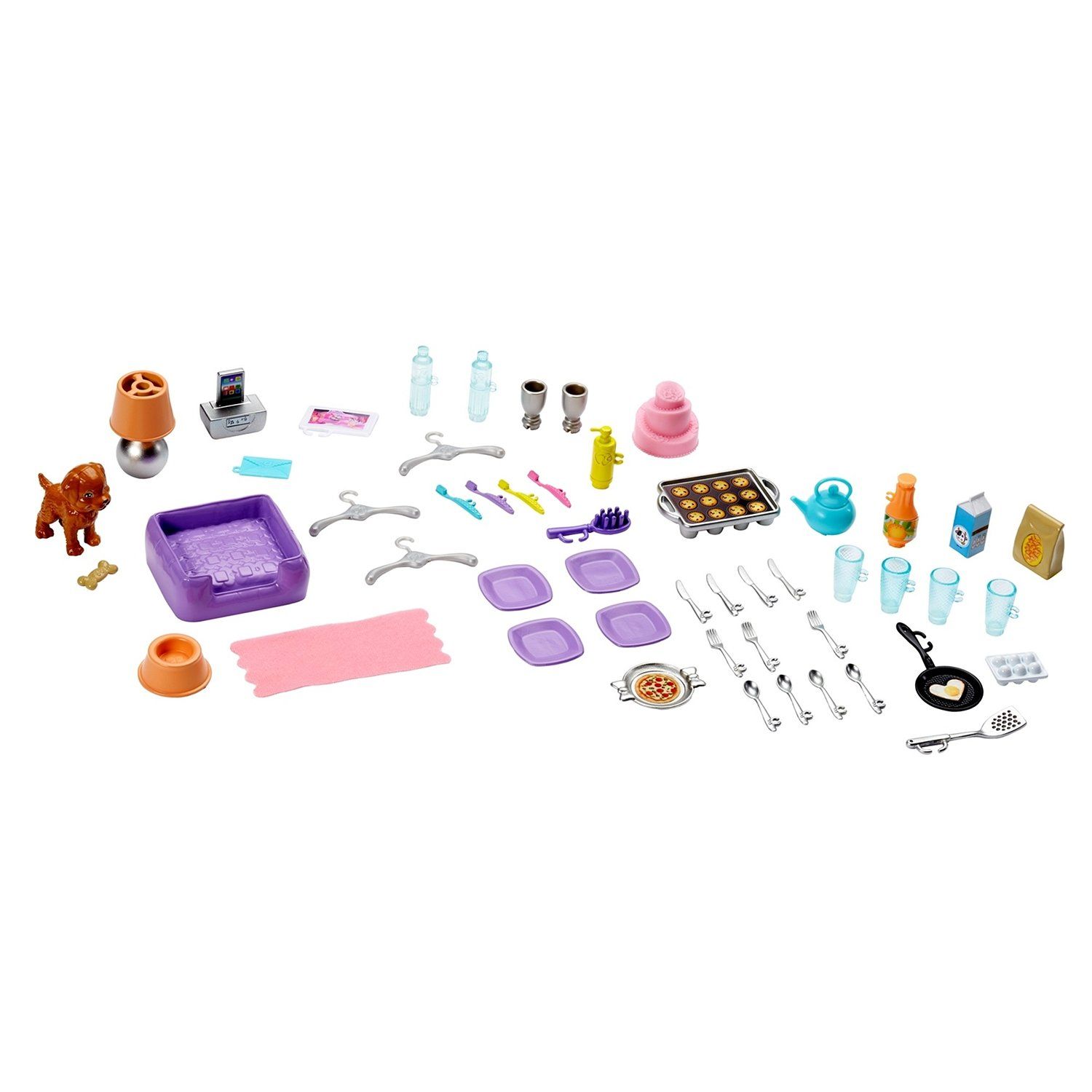 На первом этаже расположены кухня со всем необходимым для приготовления еды, на втором этаже гостиная с удобным большим диваном-трансформером, туалетная комната с раковиной, а также небольшой бассейн, который можно наполнить водой и плавать в нем, на третьем этаже спальня Барби с вместительным шкафом для одежды и маленький рабочий офис со столом и вращающимся креслом.