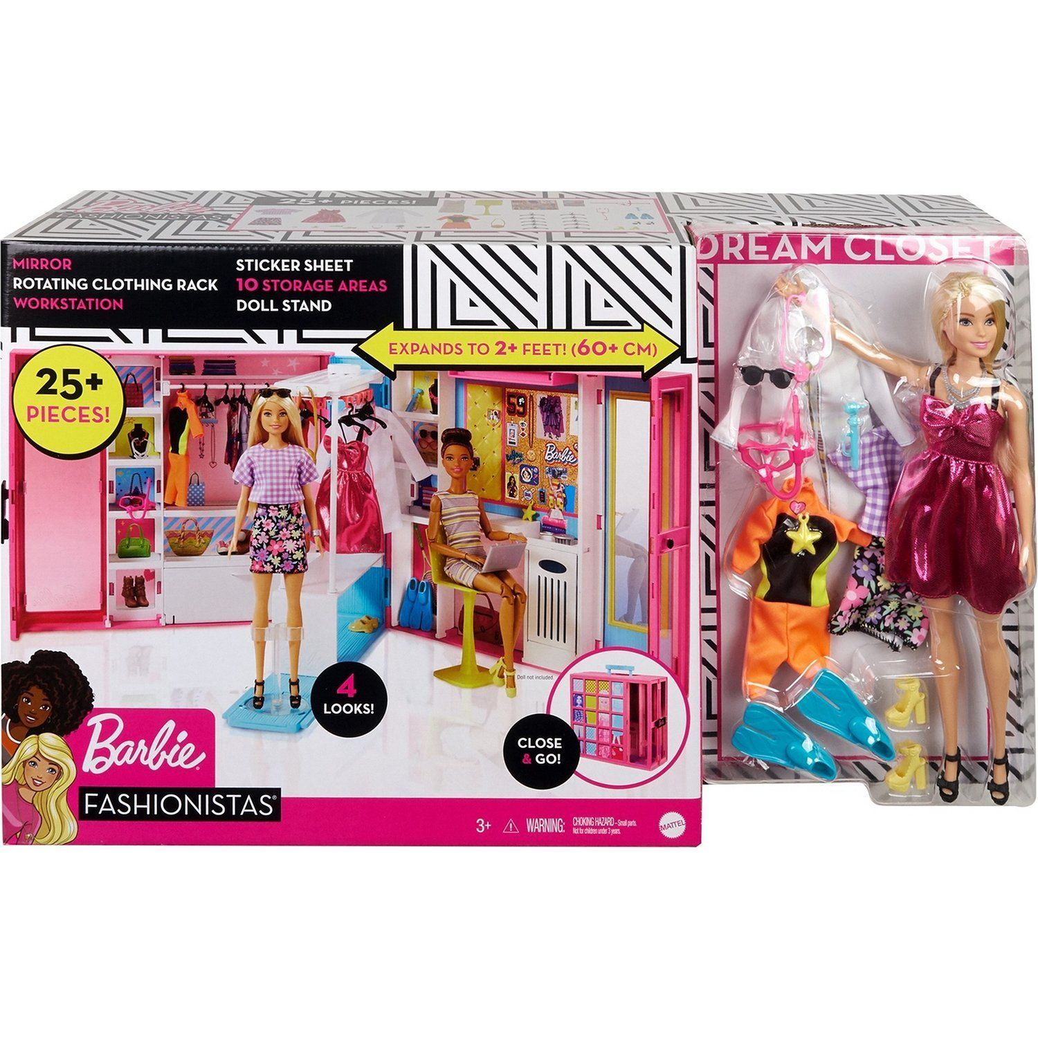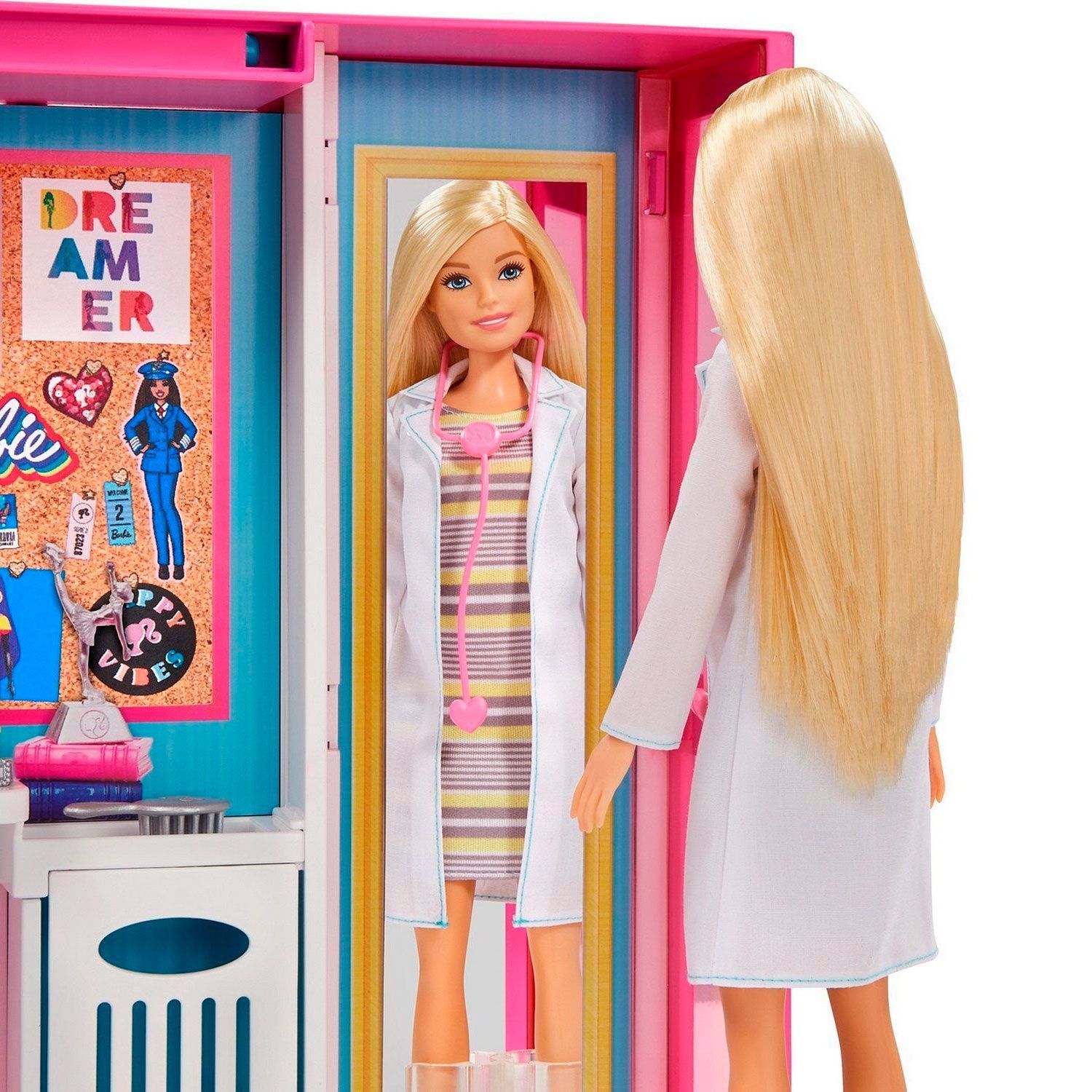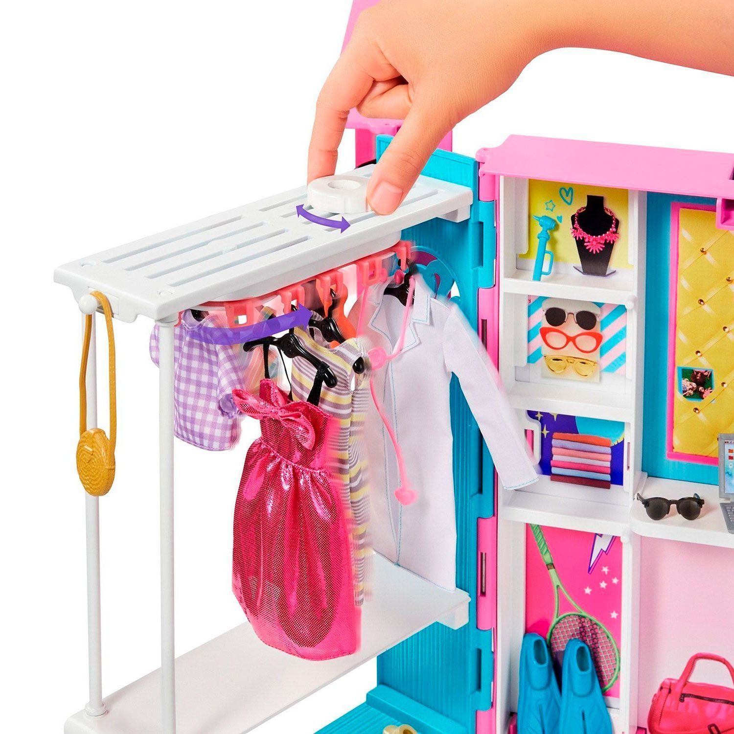 - шкаф вмещает игровое пространство шириной более 60 см с 10+ отделениями для хранения, вращающейся вешалкой, зеркалом, рабочим местом и более чем 25 нарядами и аксессуарами