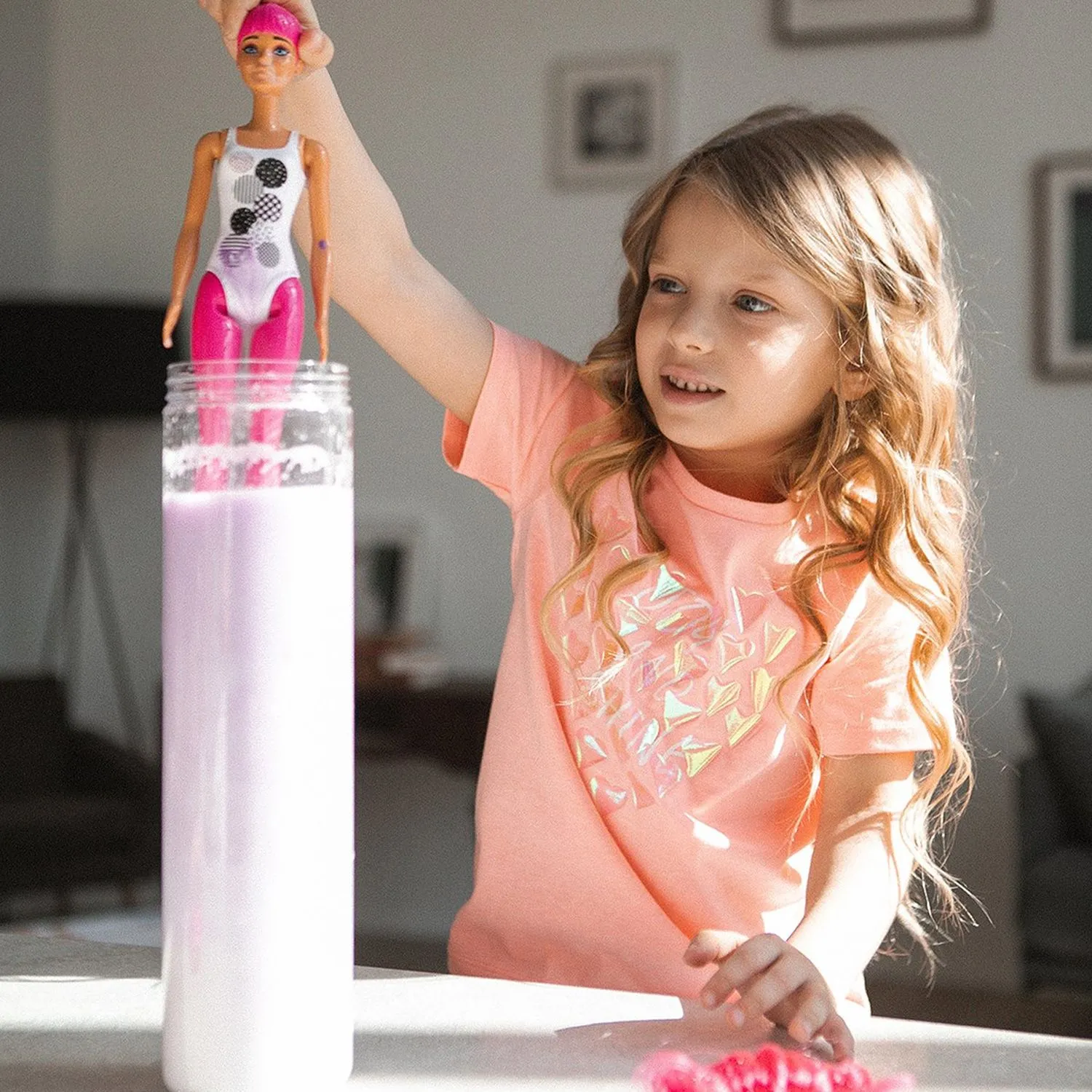 - поместите туда куклу, взболтайте воду и наблюдайте, как вода окрашивается в розовый цвет