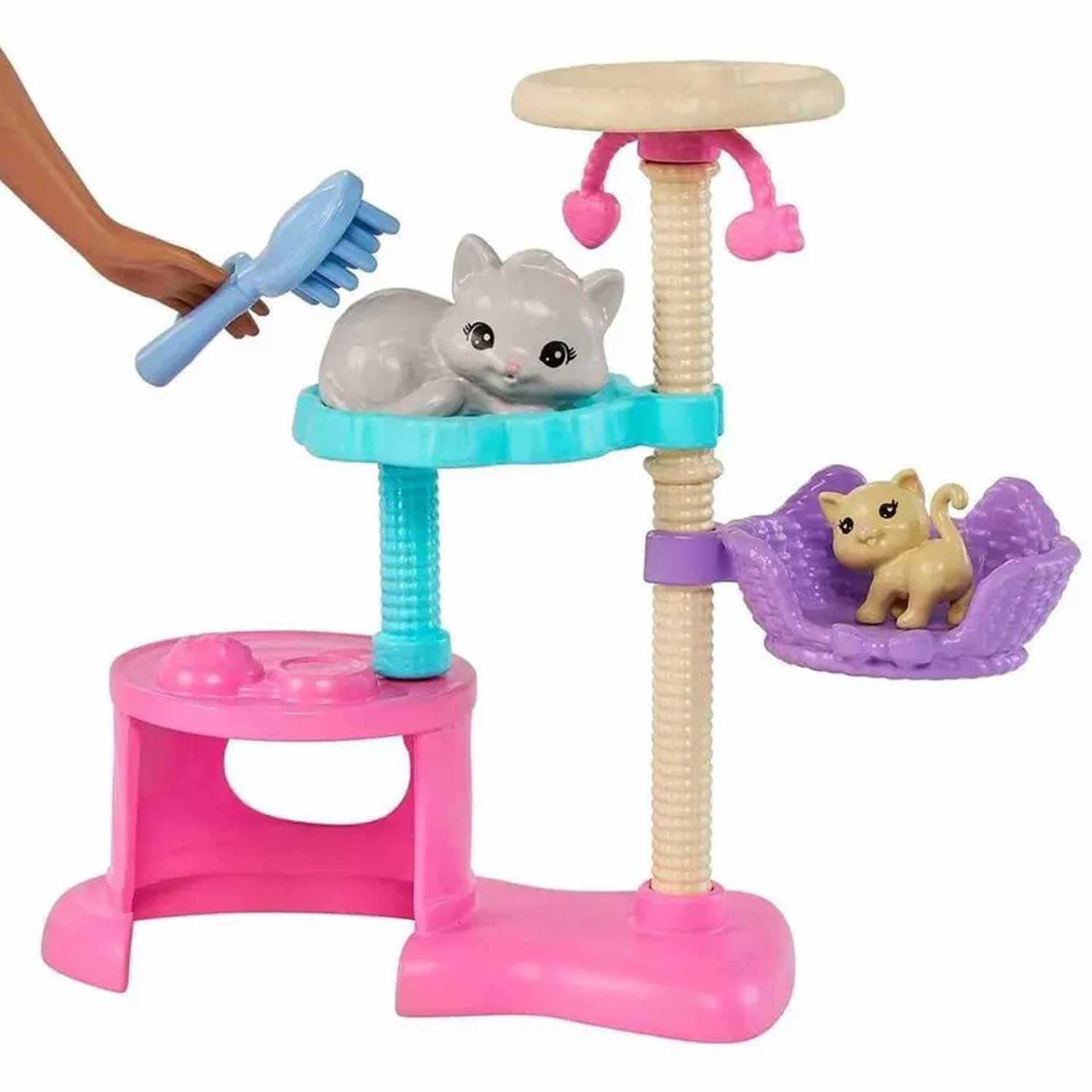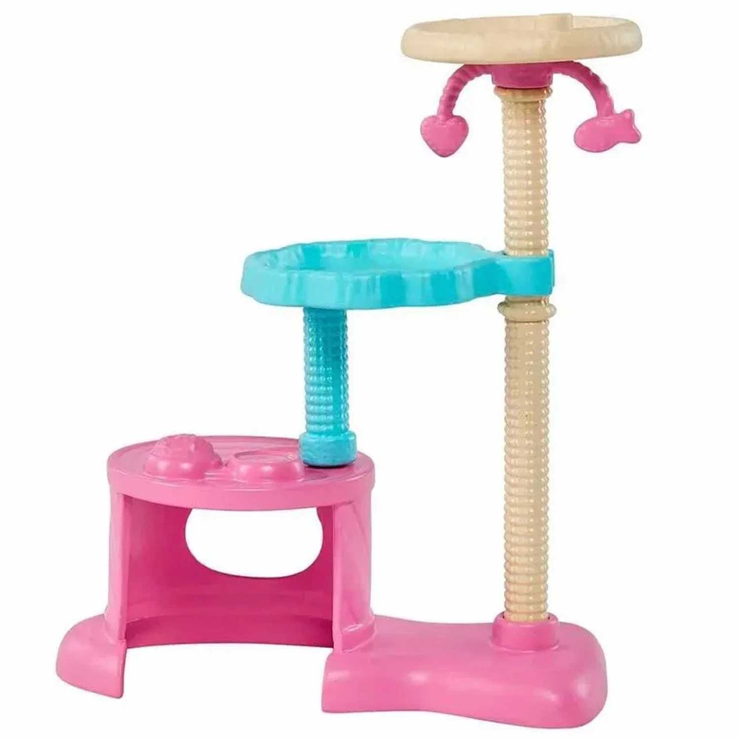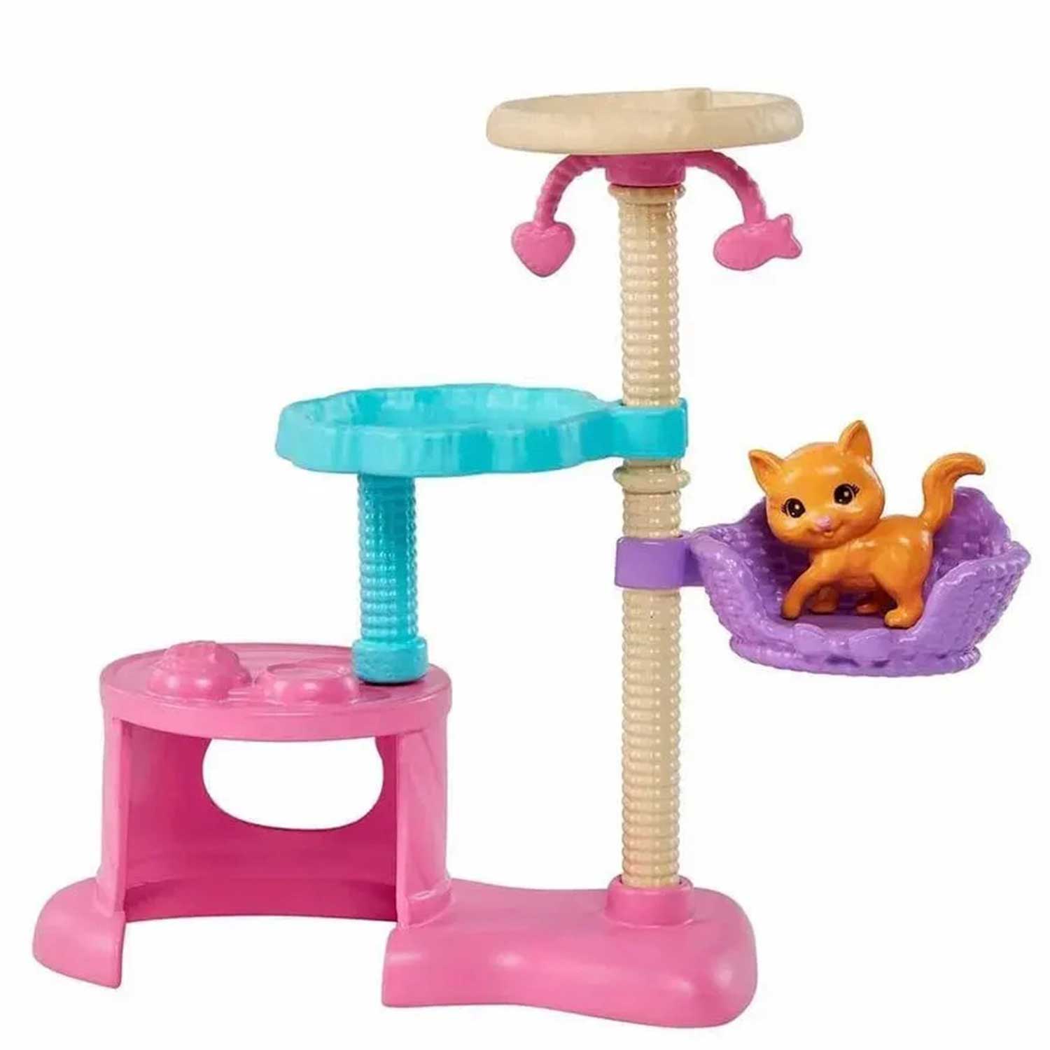 - кошачье дерево с многоуровневой конструкцией — включает укрытие, подвижную корзину, вращающуюся игрушку и дразнилку, которую можно закрепить в руке Barbie