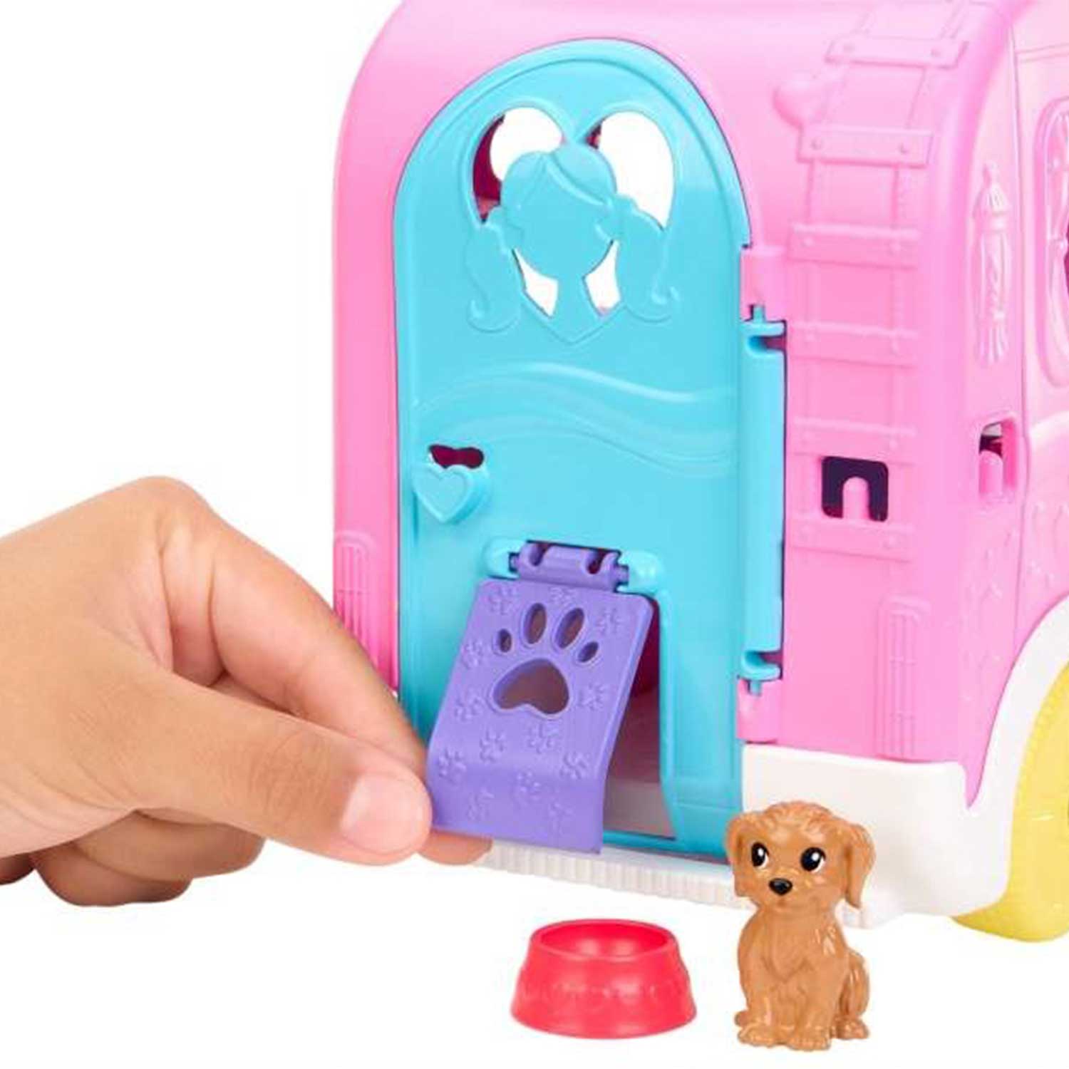 - переверните приборную панель, чтобы получить обеденную зону, и поднимите крышу, чтобы получить спальню с кроватями для куклы Челси™ и двух ее питомцев