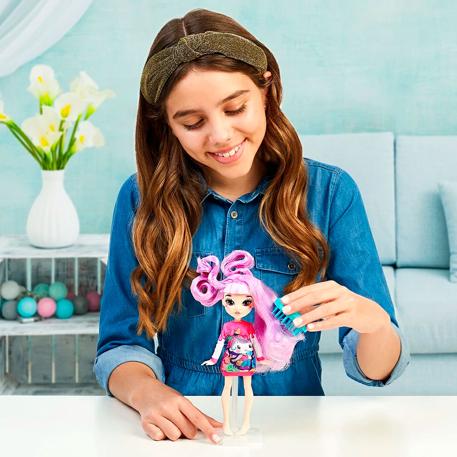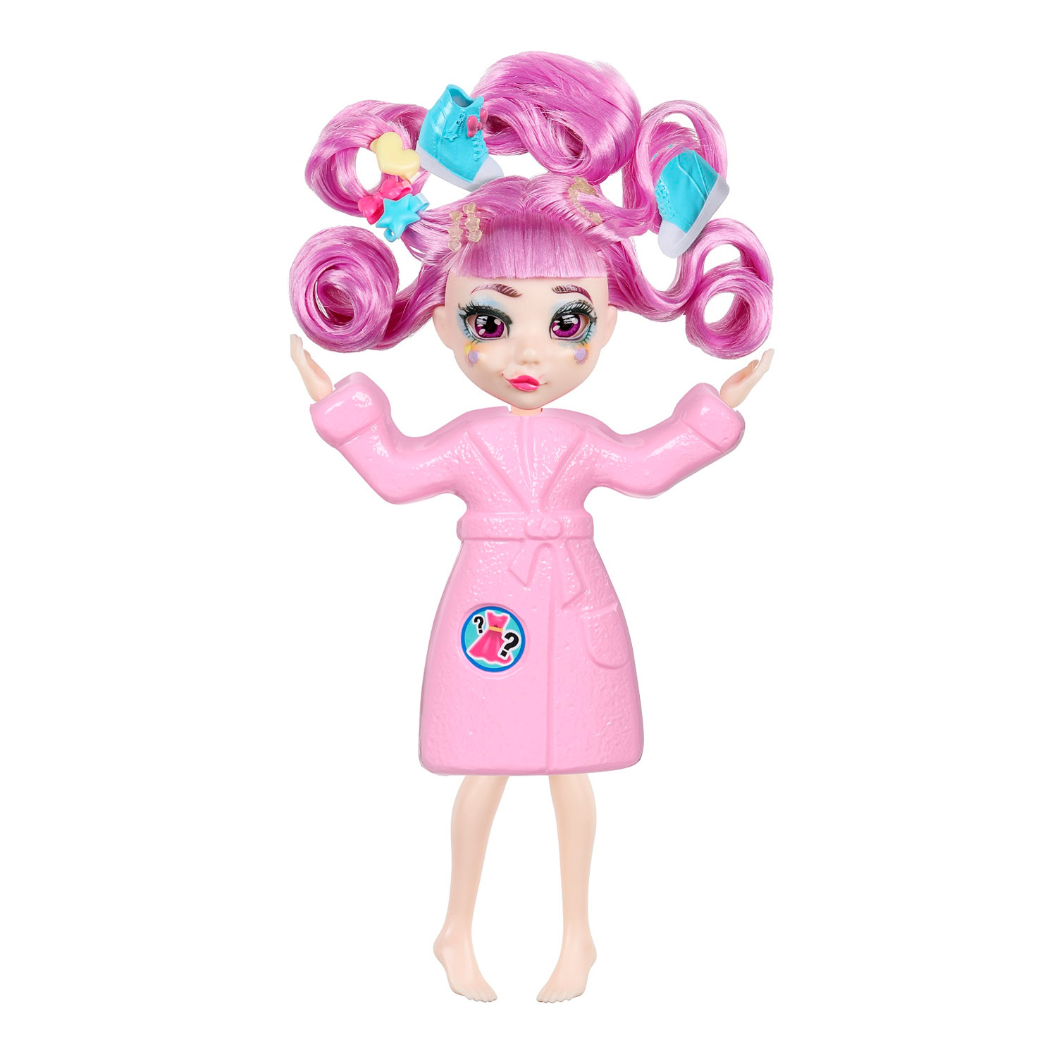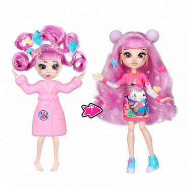 • в упаковке представлена кукла ДО преображения, изначально на моднице надет банный халат, а в волосах спрятаны аксессуары одежды и украшения