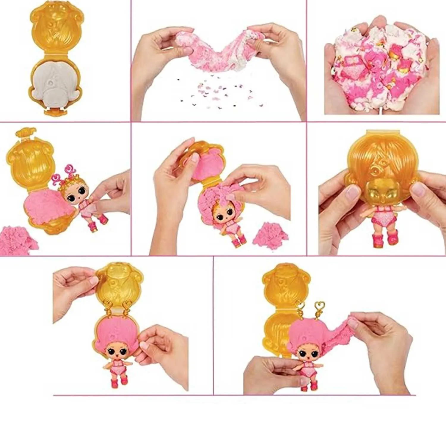 - в процессе распаковки вы найдете мини сюрпризы: кинетический песок, блестки, форму для лепки прически, аксессуары