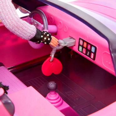 - автомобиль оснащен подвижными элементами и автомобильными аксессуарами: вращающийся руль, колеса, сдвигающиеся сиденья, 2 боковых зеркала, детализированная приборная панель, вставные ключи от машины, брелок-сердечко и ремни безопасности