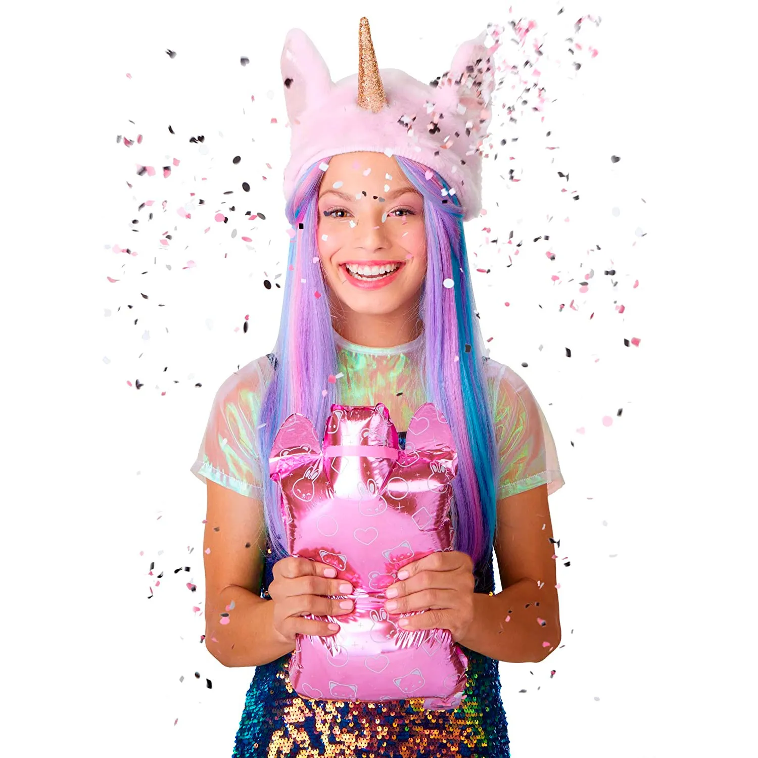 - чтобы раскрыть упаковку необходимо её надуть с помощью бумажной трубочки, затем с противоположной стороны "расстегнуть замочек" и надавить на пакет - появятся конфетти и затем можно достать игрушки