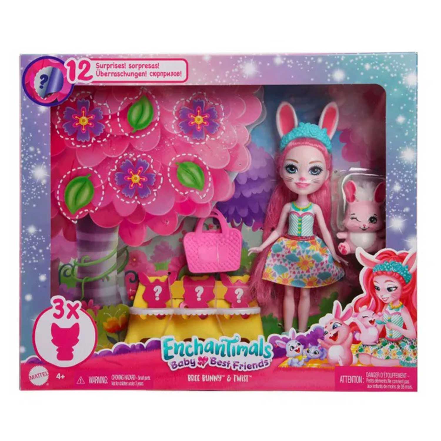 Набор от Mattel создан по мотивам популярного мультфильма Enchantimals. В наборе прелестная кукла и забавный друг-питомец, под волшебным деревом с листьями и цветами спрятаны три маленьких малыша и девять аксессуаров.