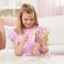 - одета в сиреневое платье с рукавами-фонариками и длинной юбкой, а в руках у неё её верный друг хамелеон Паскаль