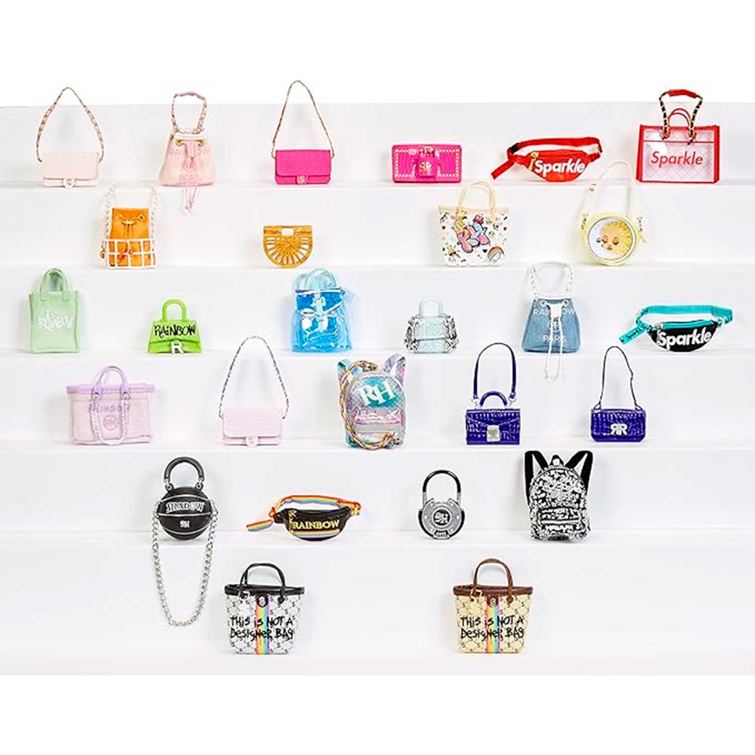 Коллекция аксессуаров Rainbow High Mini Accessories Studio Handbags включает 25 высококачественных мини-сумочек , изготовленных из мягких тканей, украшенных формованными подвесками, заклепками, вышивкой или графическим принтом.