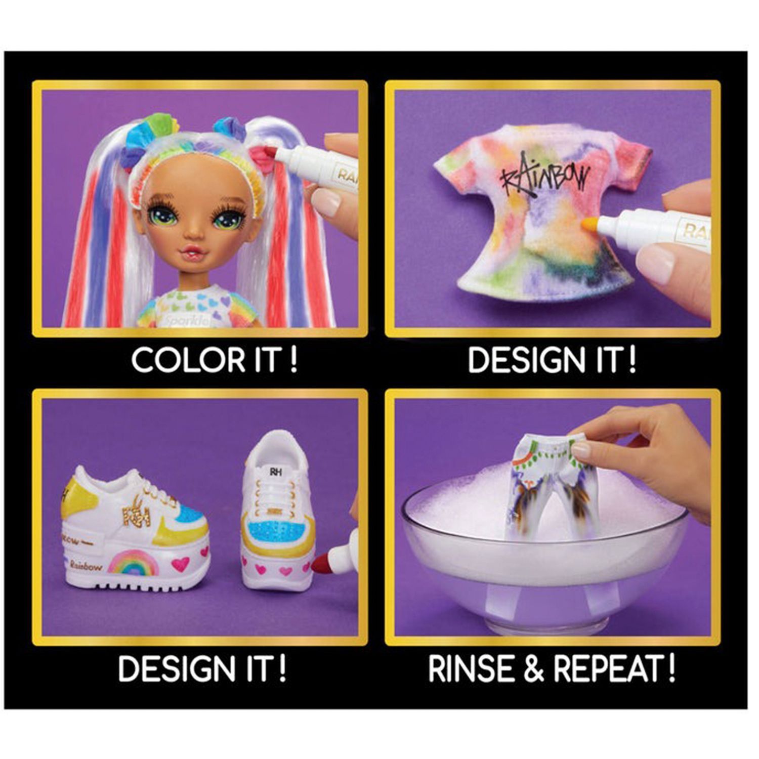 Кукла Rainbow High Color and Create – это эксклюзивная кукла, которая вдохновляет на творчество и самовыражение. С помощью многоразовых маркеров, входящих в комплект, дети могут создавать собственные дизайны на одежде и волосах куклы, а затем легко смывать их и начинать заново. Кукла станет идеальным подарком для юных художников и любителей моды.
