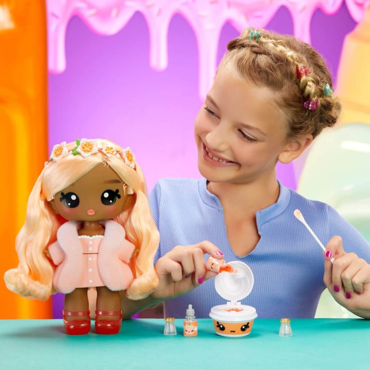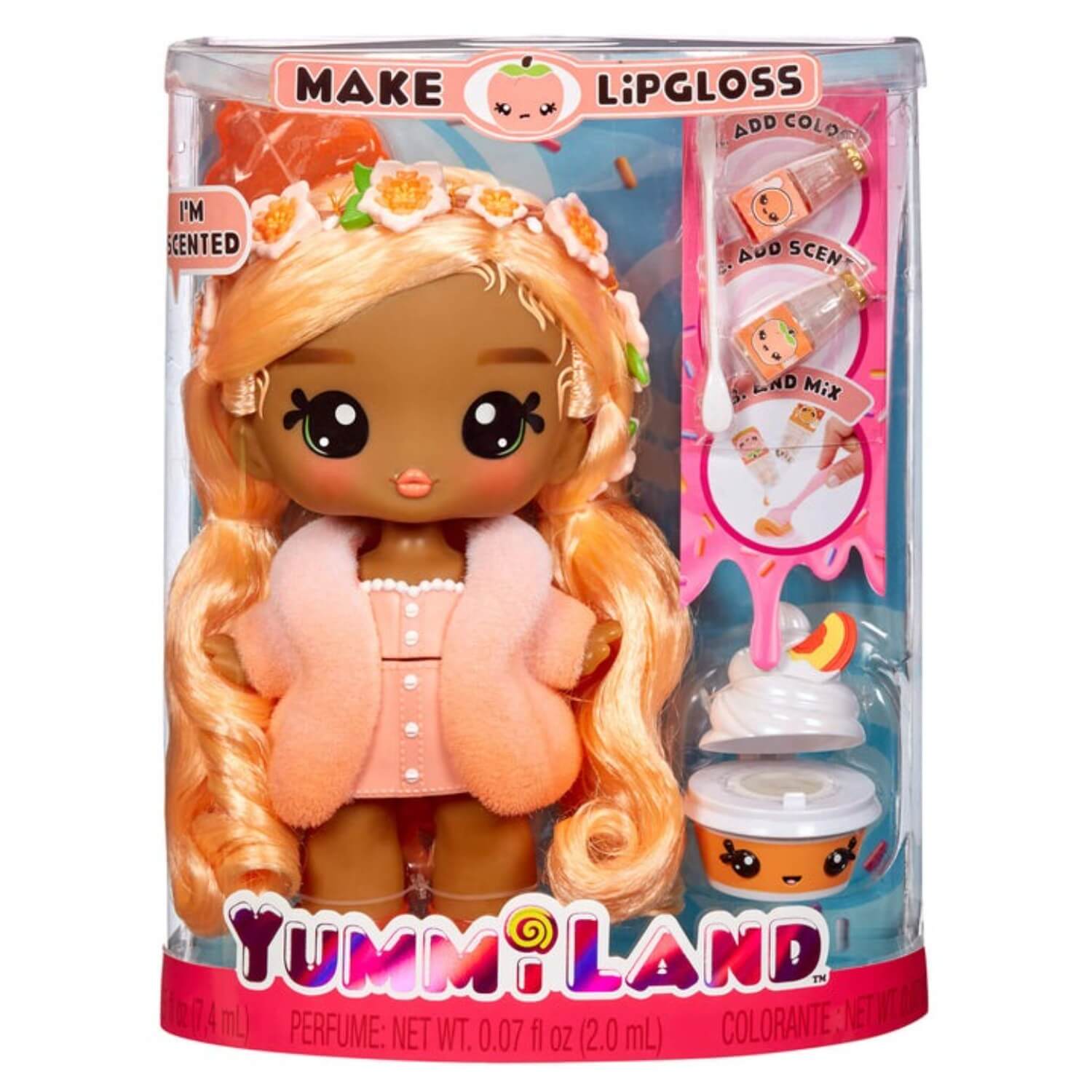 - кукла Пайпер Пич идет в комплекте с ее персиковым нарядом и соответствующими туфлями, которые можно использовать попеременно со всеми куклами Yummiland. На ее персиковых мягких волосах красуется ее персиковая цветочная корона!
