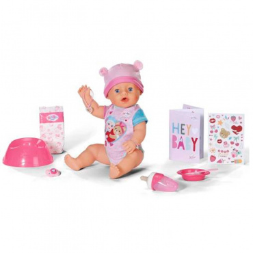 - у куклы 10 интерактивных функций: закрывает глаза, если повернуть во рту куклы соску, спит с закрытыми глазами, умеет пить из бутылочки, плачет настоящими слезами, писает в подгузник и в горшок, умеет есть с ложечки, можно купать, суперподвижная, быстро сохнет