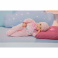 - игрушка хорошо проработана и детализирована, у нее маленький носик, пухлые губки и большие распахнутые глаза- малышка одета в милый розовый комбинезончик, на груди нашит кокетливый объемный бантик, рядом нарисована забавная овечка в цветочках, а на голове шапочка в тон к наряду