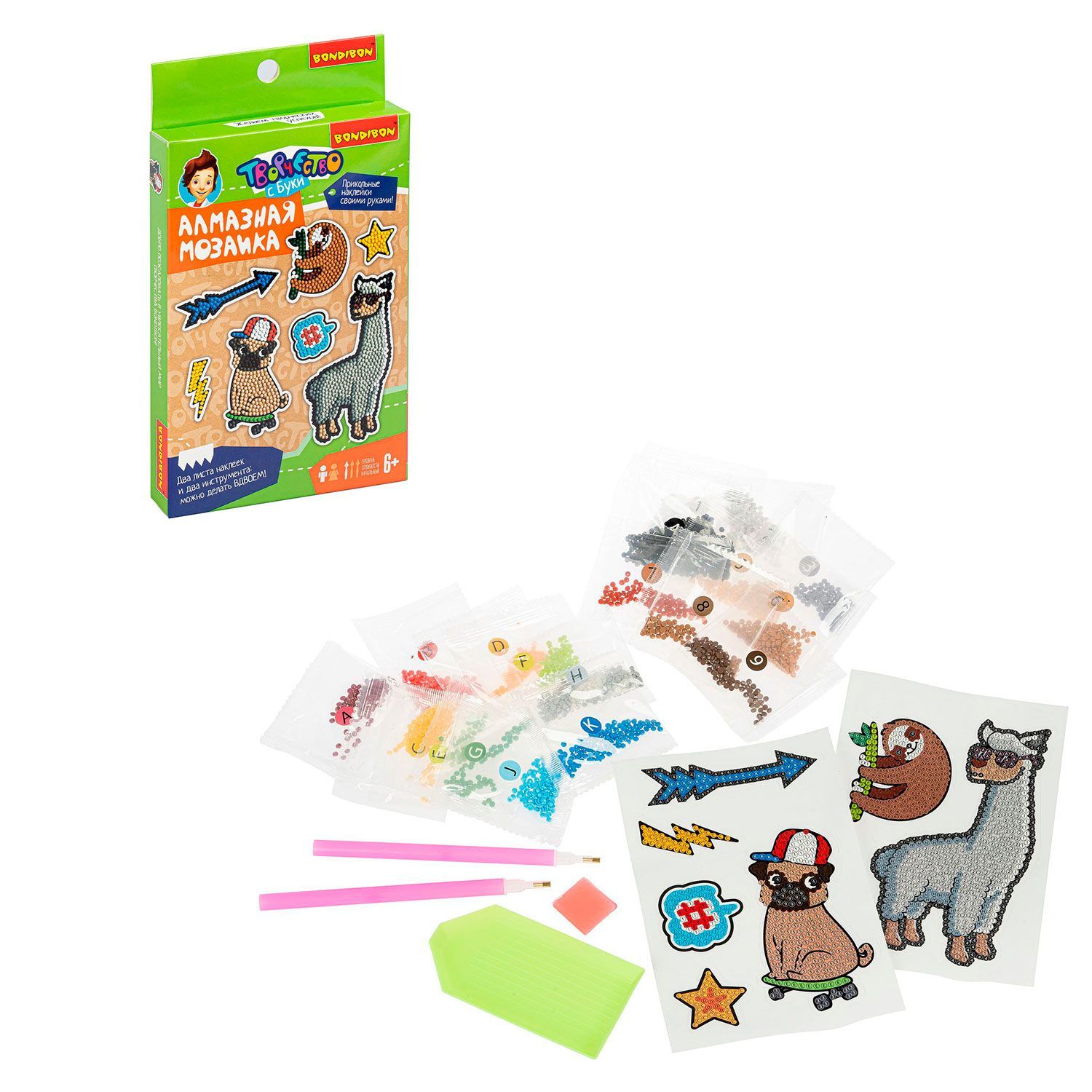 Набор для творчества Алмазная мозаика "ЛАМА" серии Творчество c Буки от ТМ Bondibon позволяет создать 7 переливающихся наклеек.