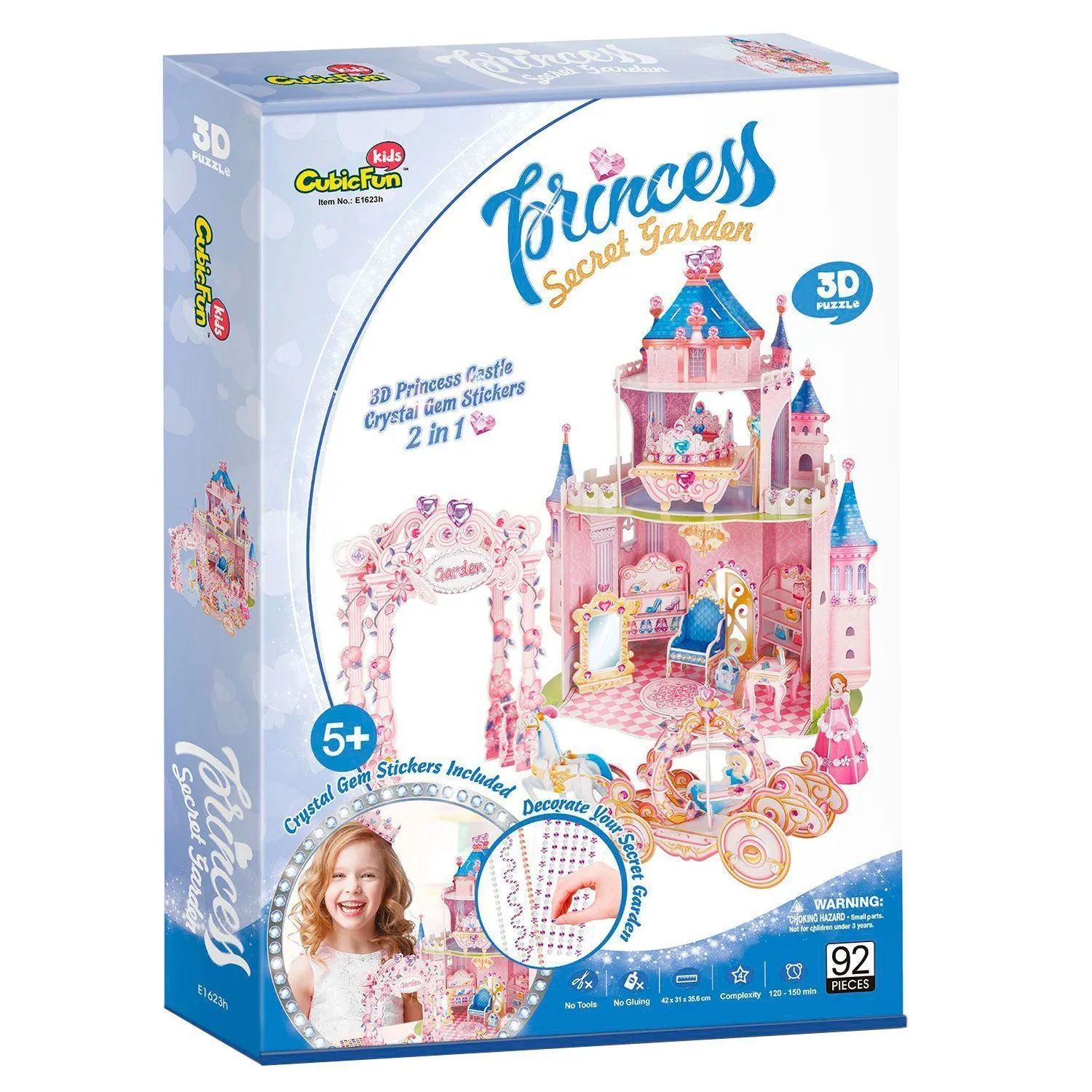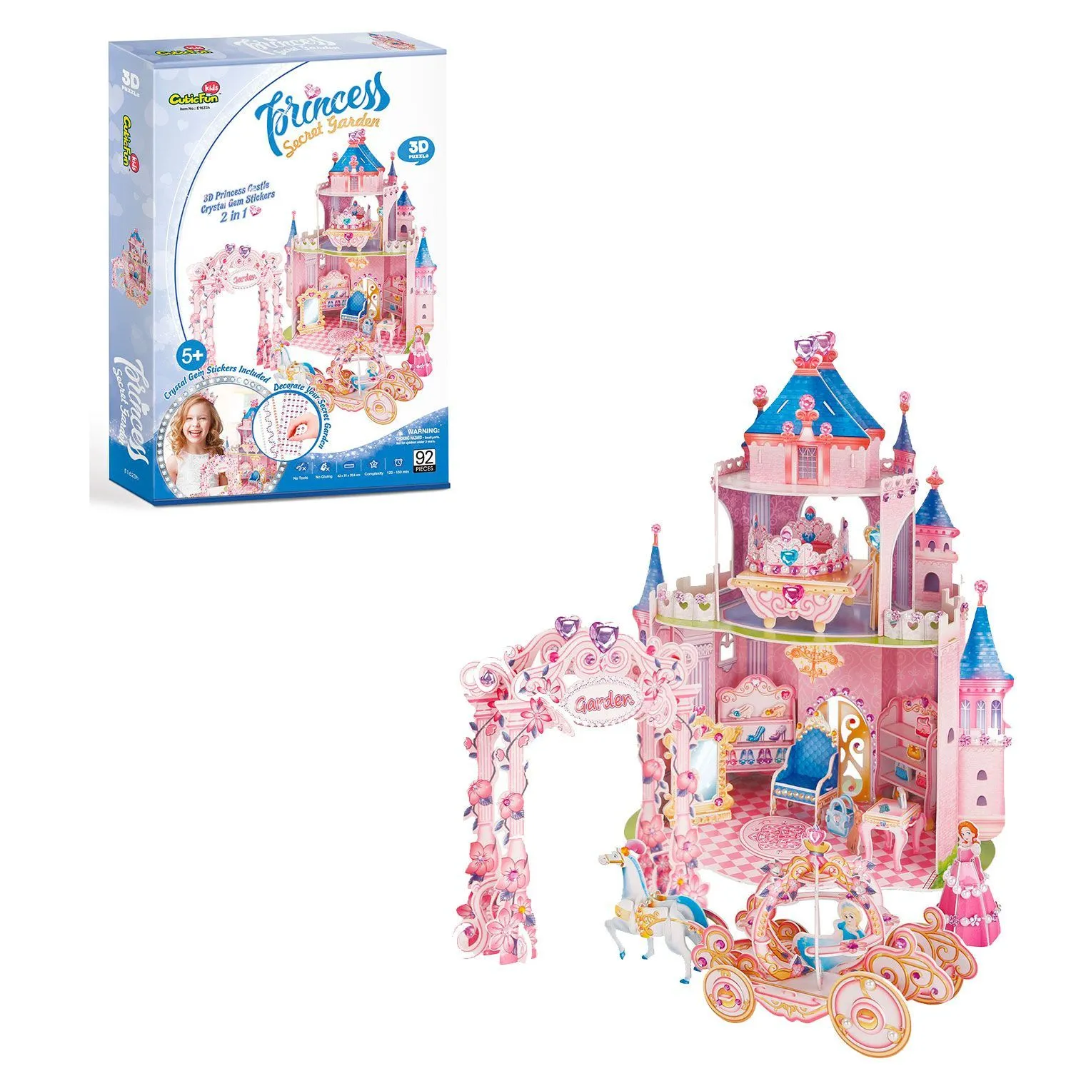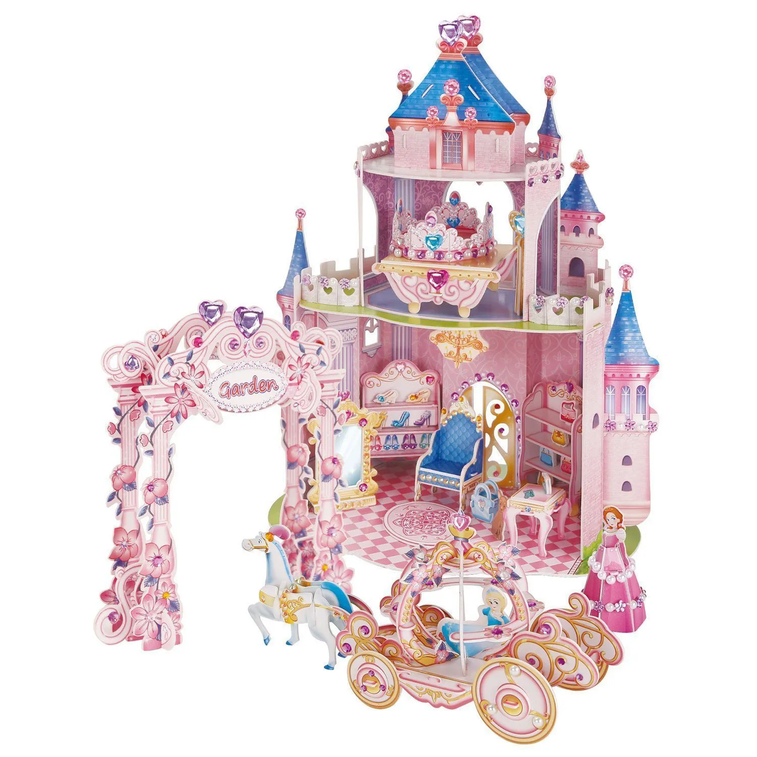 Развивающий 3D пазл в форме роскошного замка с дополнительными игровыми элементами в виде кареты, запряженной белой лошадью, цветочной аркой, а также внутренний интерьер дворца смогут покорить маленькую принцессу в самое сердце.